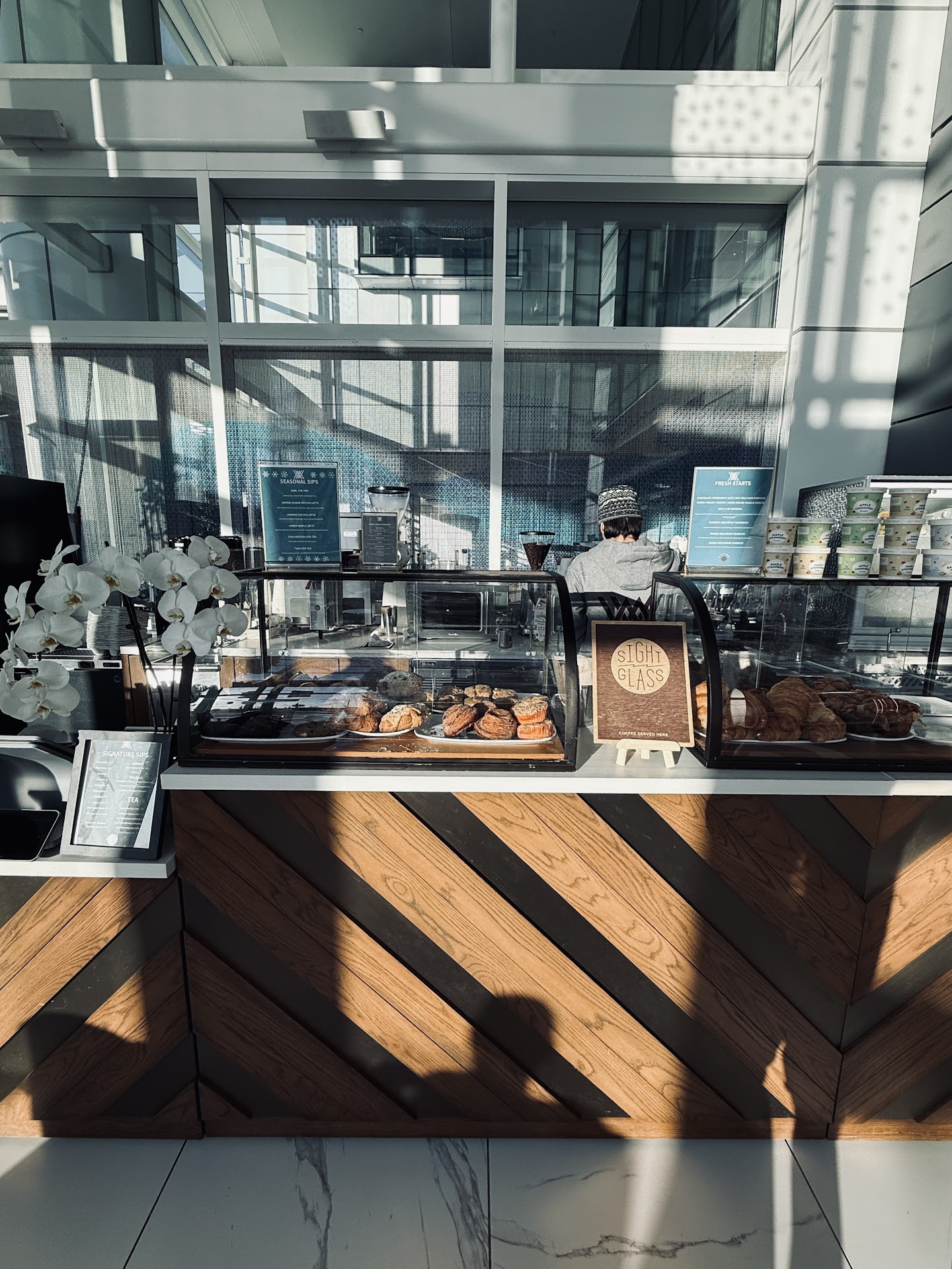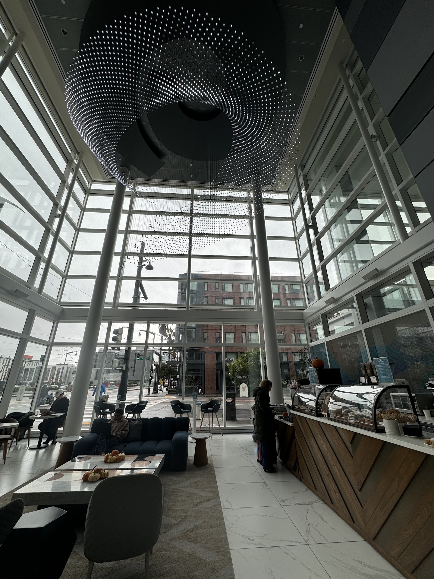 Read morei stayed at the hotel and was excited to try the cute cafe in the lobby. they had this amazing art piece hanging from the ceiling. i got a pistachio berry croissant and that looks like the viral crookies on tiktok and i asked them to warm it up and it was so good. i got a oneof there seasonal menu drinks a cookie butter latte with cinnamon on top and it was so good and not too sweet which i like. The workers were also nice and gave me a cute design...