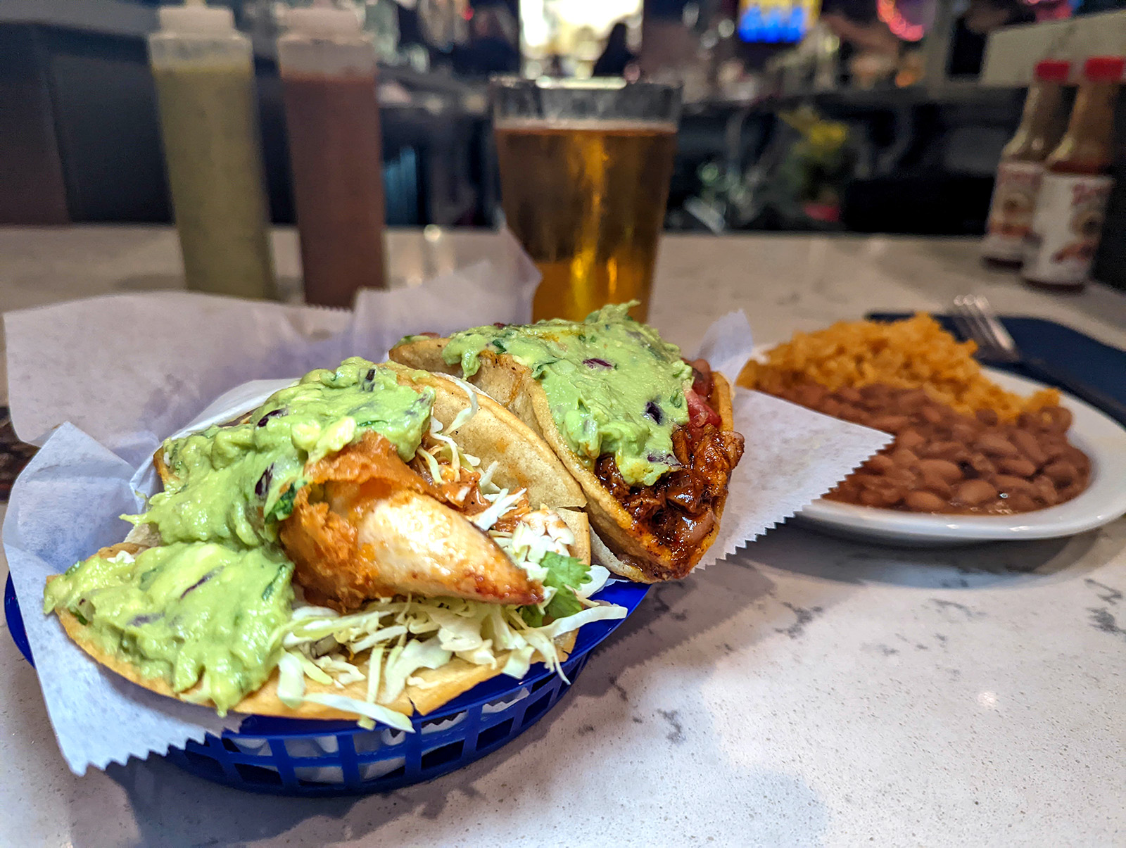 Updated review 2/16/2022: We tried coming here a few Sundays ago but there was a line out the door just to get in. We decided to postpone our Underdogs visit to a weekday instead. Last night we had 2x Nick's way baja fish tacos $7.75 each, chorizo taco $6.50, steak taco $6.50, chips with salsa & guac $8.50, beans and rice $2.50 and pints of refreshing beer. My friend and I were arguing which is better, Underdogs' full bar and beer selection or the delicious food that their kitchen puts out. On one hand, there's always new exciting beers to try here. On the other hand, we noticed their meats are always very savory with authentic spices. O, I almost forgot to mention their green and red sauce bottles on the table. Regardless, their staff should get a lot of credit because the bartenders are awesome, waitstaff super attentive and the kitchen crew are just plain wonderful. My only regret is that I need a bigger stomach to fit more of their tacos. One minor nit pick though. Did their chips get harder? I realized the roof of my mouth was all cut up after eating a few chips. Maybe I ate it too fast again.