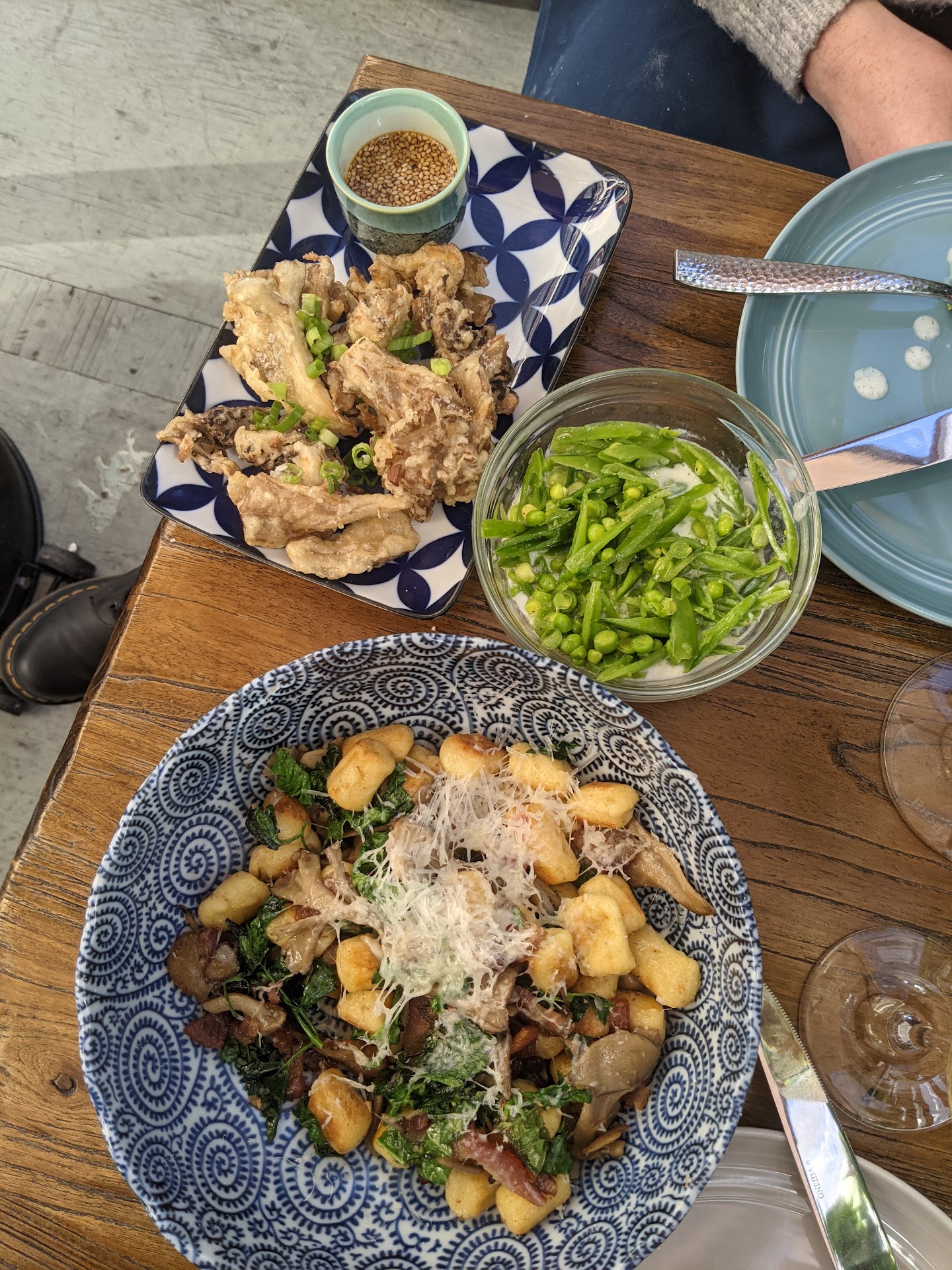 We really enjoyed the food, we got the Parisian Gnocchi, the Snap Pea Salad, the Vinegar Fries, and the Tempura Mushrooms. All of it was delicious and fresh, and it was one of the best meals I've had in SF in a long time. The food prices were pretty reasonable, the portions were a bit small but not pretentious. Our waiter was also very friendly and gave us some great recommendations.