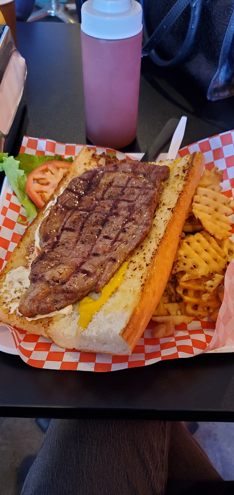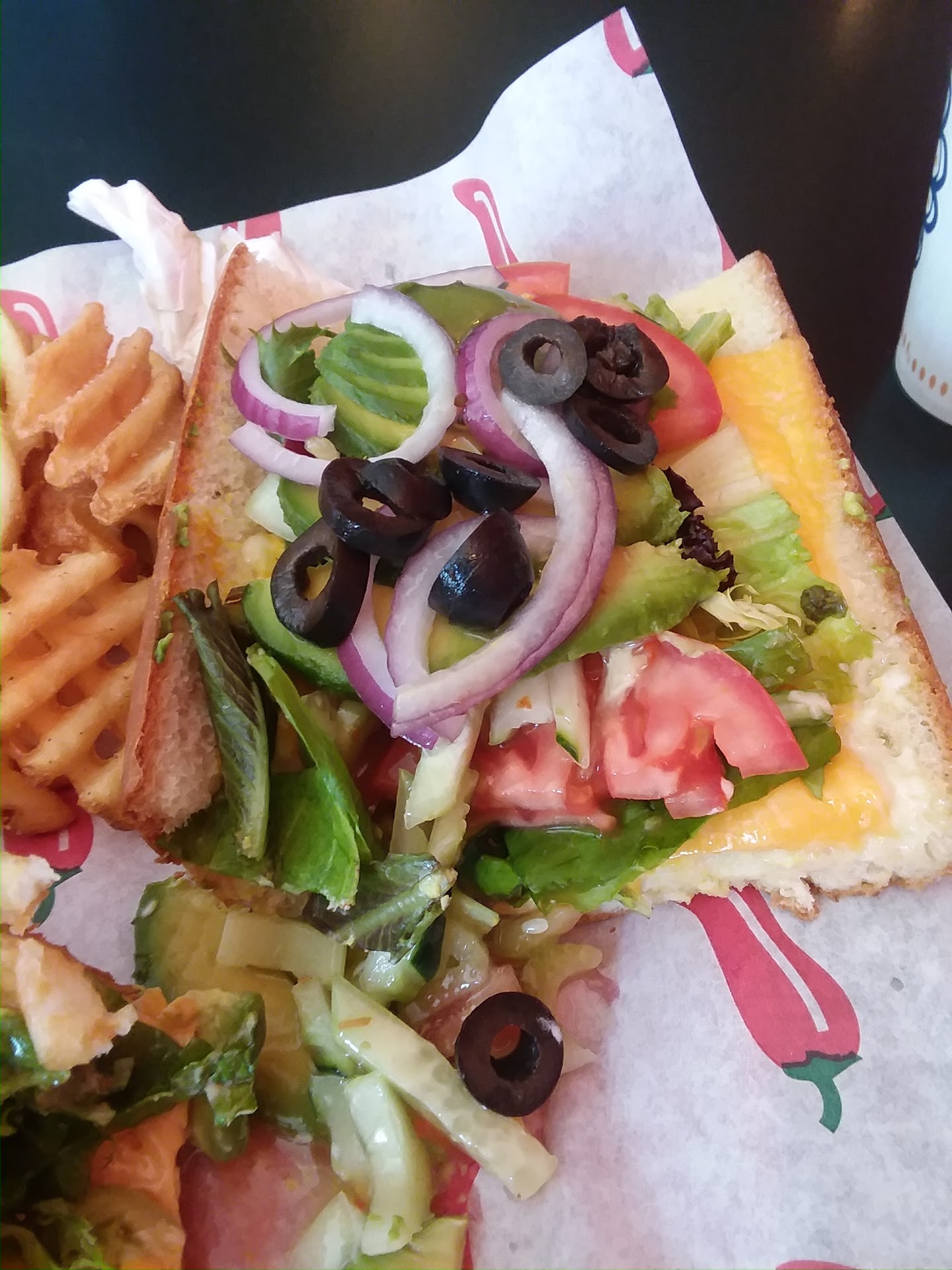 Read moreIf you are veg: this is NOT the place for you. The only vegitarian meal options on the menu is a hot or cold veggie sandwhich, which contains lettuce, tomato, onion, cucumber, carrots, olives, celery, avocado, and vinaigrette dressing on a bagette roll (cold sandwich also has mayo and mustard, hot sandwhich has melted cheese, pictured). As far as I know they do not have a veggie burger patty. Beyond that, their waffle-cut fries are pretty good, and I'm sure their meat options are up to par, but their veg options have not been...