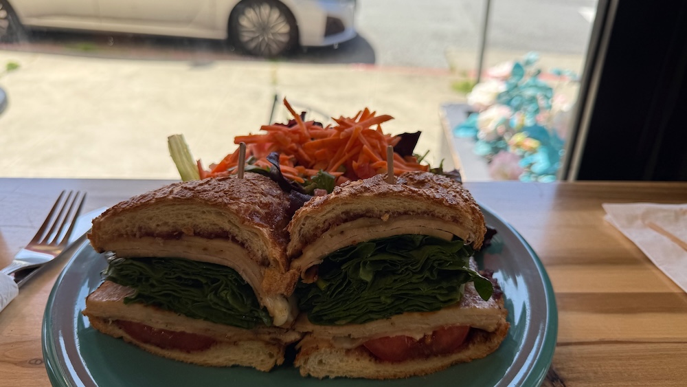 My wife ordered the Eggs Benedict - traditional but with Acadaco, served with house potatoes (or a green salad). I went with the Coppi Turkey Sandwich. In a short period of time the server brought the food to us as we sat on a bar facing the street. My sandwich was tasty - Turkey with Jack Cheese, Cranberry Sauce and Spinach. It was served with a substantial side salad (which was enough for a meal, honestly). Both of us enjoyed our meal and said we would definitely return here. Prices were reasonable for The City and its location is close enough to Golden Gate Park. We did find parking just across from the Cafe on McCallister. They’re open for breakfast and lunch only (closing...