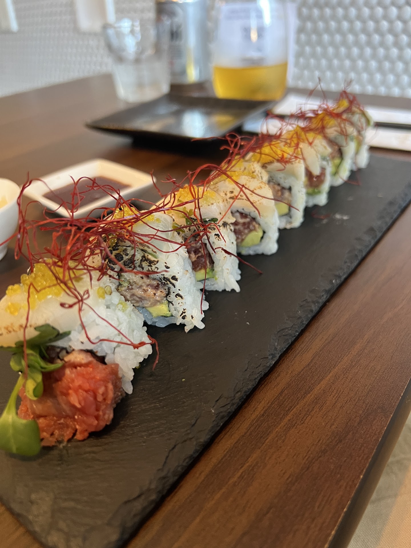 We got the nigiri tasting, an appetizer and two rolls to share. The nigiri tasting is such great value. I think it is comparable to some of the hundred dollar omakases I have been to. The rolls were delicious as well. My favorite roll was the Wabi-Sabi roll. I loved the flavor of shiso with the scallop. My partner really liked the chu-toro lovers roll which was creamy and rich.