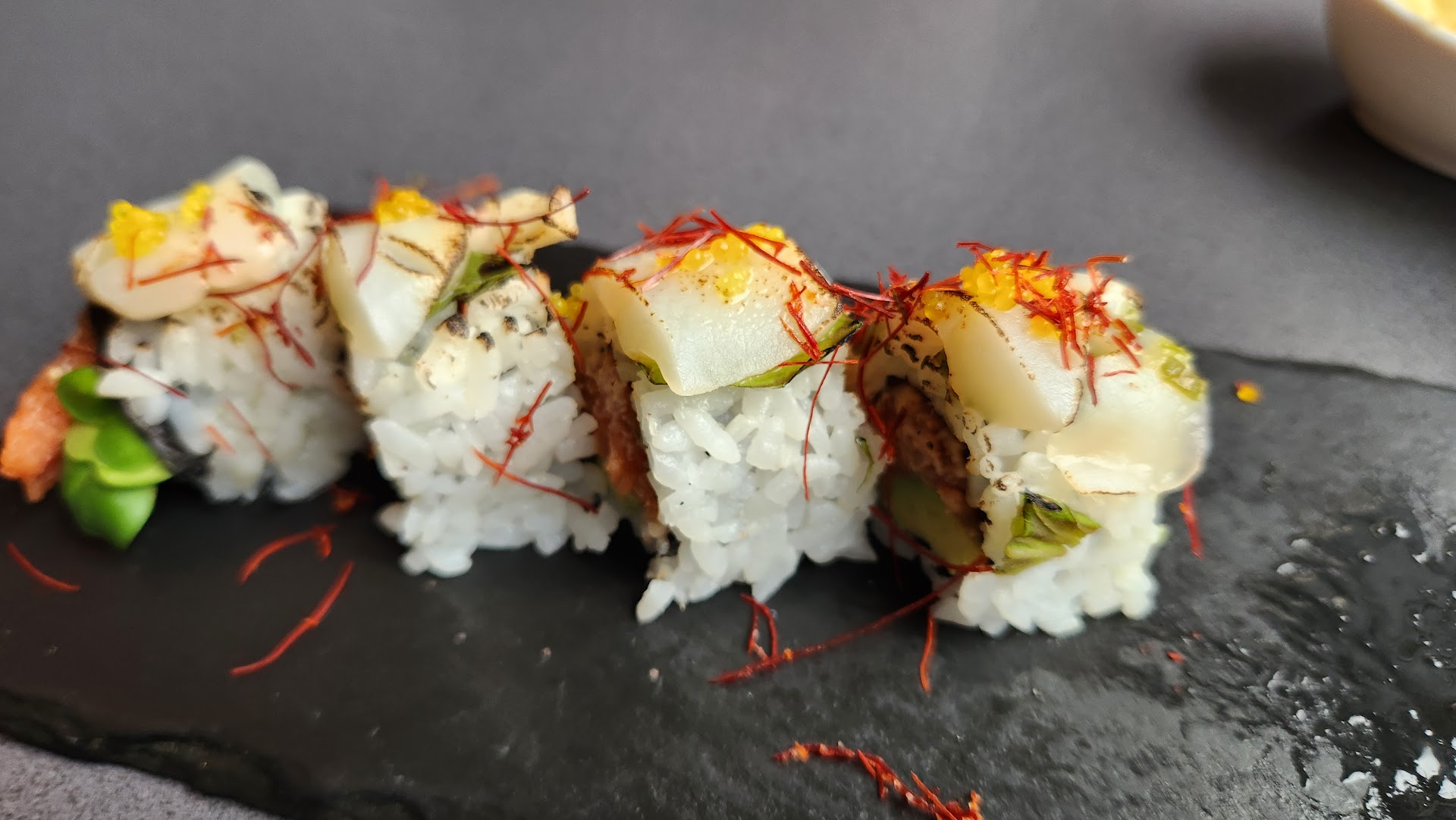 Tried the Wabi Sabi roll - scallop on top is actually clean tasting, sweet, lightly seared. Shiso underneath is a great garnish with the scallop (hotate). Spicy Tuna inside is yums. All together, surprisingly delicious.