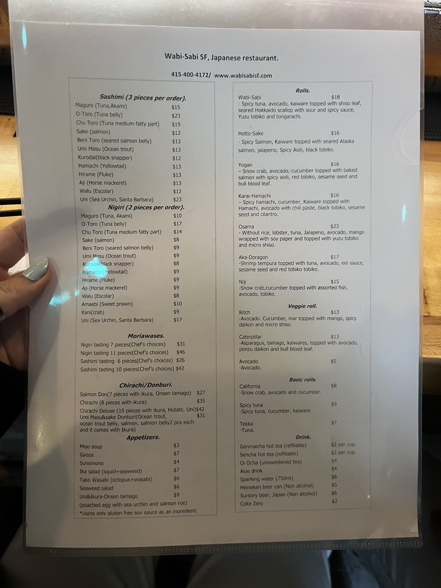 My son took me to Wabi for lunch and I have to say that the quality and the freshness of the fish was not like I have experienced before! My son had told me how he just happened to stumbled upon this sushi restaurant by accident…and I’m glad he did! The service is great. We were served quickly and attended to personally. The restaurant it’s self is very small, maybe 25, at the most and as we ate there, a steady stream of “Uber eats” and “Grub hub” drivers arrived for “pick up” orders, you could tell that Wabi is definitely a hidden gem! Tucked away from the hustle of the city, Wabi is on Ritch St. (an alley), just off of Bryant, near Oracle Park. When the food arrived, it was perfectly presented. Nothing fancy at all, but expertly laid out. The thing that impressed me the most was, that the sashimi I had, was not like any other sushi I had eaten before! It’s quality and freshness was a definite step above what I have eaten in the past. Don’t get me wrong, the sushi I’ve eaten before Wabi, has always been too notch but the way the fish appears and tastes at Wabi, stands in a class of its own. The cuts were buttery smooth and bursting with flavor! The tuna, (which is usually a pretty stock fish, nothing special) truly blew me away! I’ve Never tasted any Maguro like this before, and even though I can’t recall the exact taste now, I know that it was special and of a unique quality! But believe me, Everything was special and so delicious. Aside from the fish, I had some amazing seaweed salad, that consisted of (what I could tell 3 different types of seaweed), was super flavorful and not overpowering. The Miso Soup was very pleasant and awoke my taste buds, to anticipate the meal that would follow! (I honestly was a little “skittish”, to eat anything at all because I was experiencing nausea due to a bad reaction to a medication I was taking but everything I ate did the trick!) I can’t recommend Wabi more! It’s definitely in a...