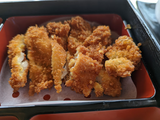 I soon received my lunch box. Still no napkins though. I looked around and didn't see a single napkin dispenser or and the cashier had gone into the kitchen. The miso soup was great, the rice was perfectly cooked, and the half of a boiled egg was a boiled egg. However, the salad had too much dressing for me. The chicken katsu was fantastic. The chicken was ultra-tender but the breading was crispy. Probably the best chicken katsu I've had. The pork gyoza was also wonderful. The filling was tender and flavorful while the outside was crisped and toasted. Both items tasted great with the dipping sauce. There was also a container of chili oil, but I didn't use it.