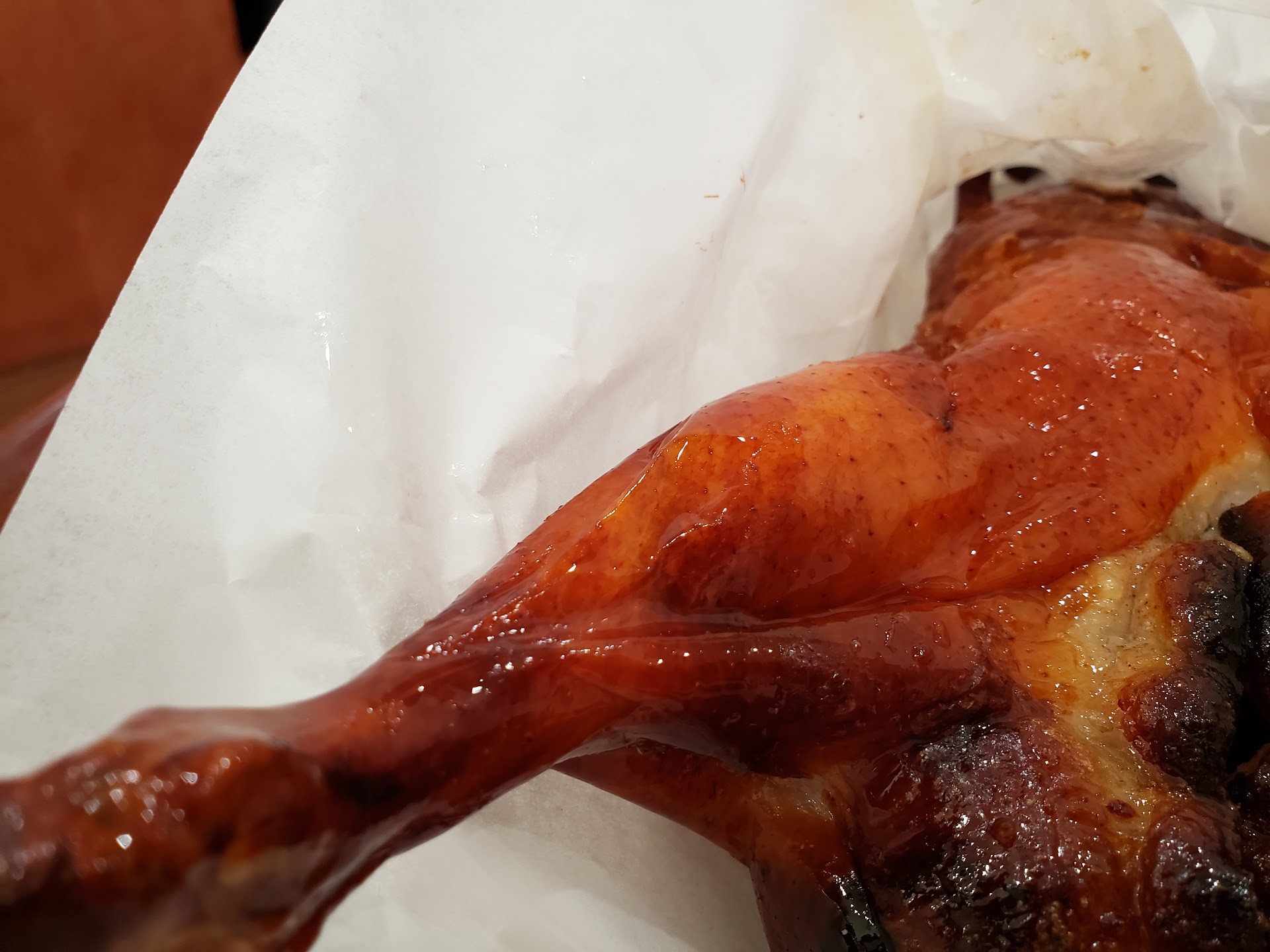Call and Order ahead on the phone and have someone drive you over there to pick up. Take it home (whole), heat it back up in an oven to crisp the skin and then cut it up Chinese style into bite size pieces. It's worth the effort .