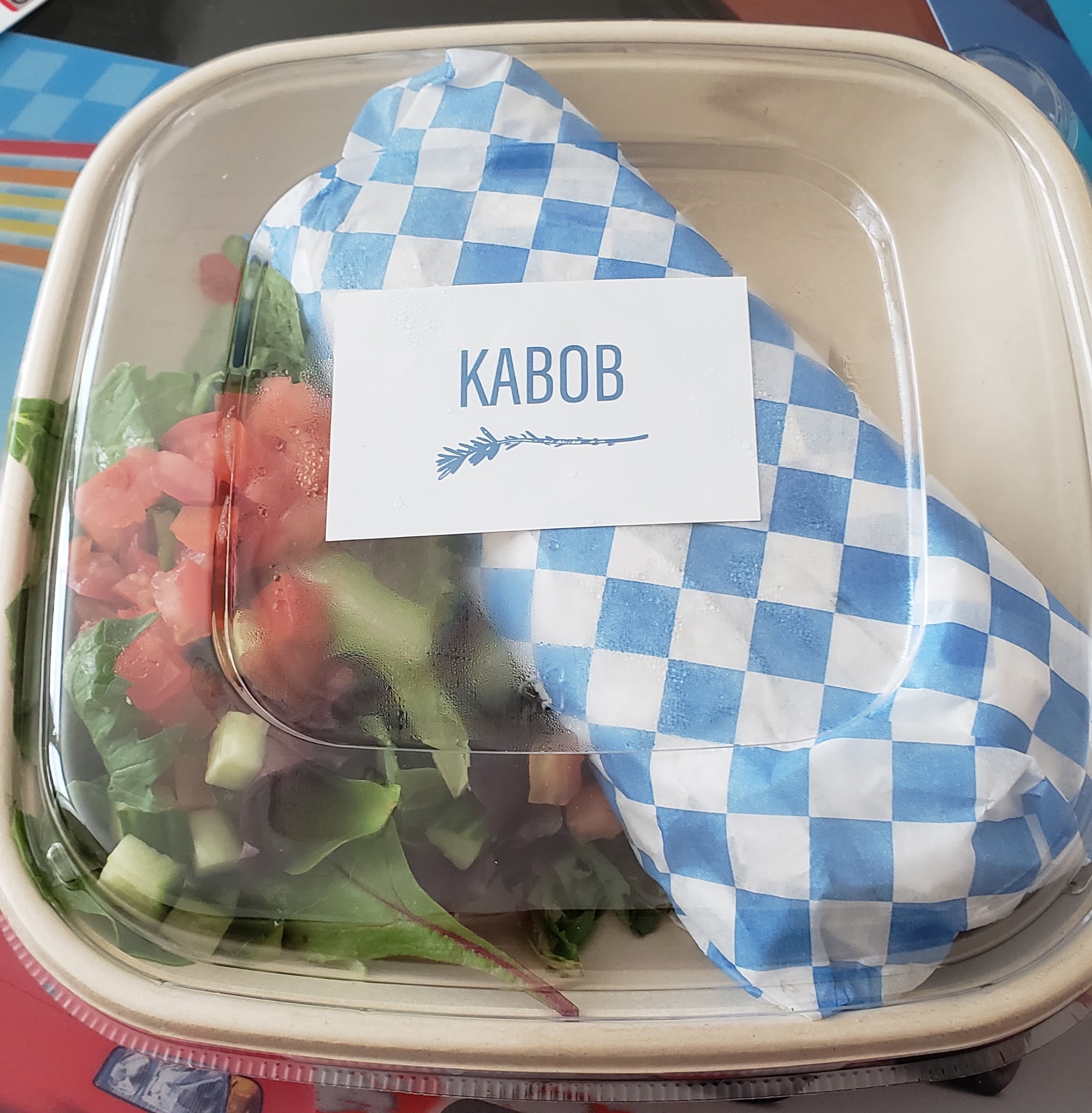 I got a Lamb & Beef Kabob Rice Bowl ($20.45) and it was excellent. It came garnished with parsley and with a small container of some kind of pink, salty yogurt sauce. The seasoned rice was full of flavor, the vegetables had a great crunch, and the meat, cooked medium, was tender, juicy, and tasted strongly of lamb. I wonder if there was actually beef because I've had patties with lamb and beef blended together and they don't taste as lamb-y as this.
