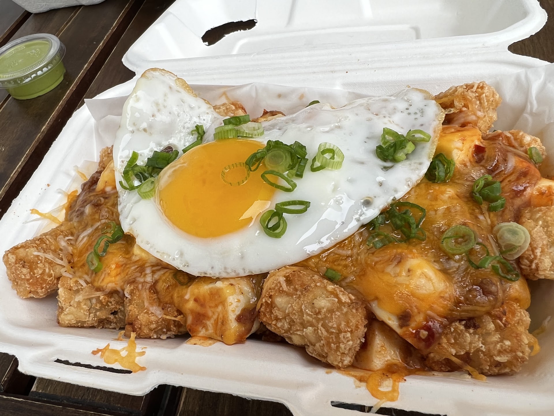 Food Since it was our first time here we wanted to try many of their items. We ordered: Honey Walnut Shrimp Burger - This was quite good, pretty much if you ever had walnut shrimp as a dish, picture that in a burger. Spicy Popcorn Chicken - This is a classic Taiwanese snack, and they do it quite well! Mapo Tots- Added the fried egg for $1.50 - This was so interesting. Being a fan of Mapo Tofu, then adding it on top of tots was actually pretty good. HEY Sesame Milk- They mentioned that they made the sesame in house, although it was quite good, I would probably ask for less sweet next time