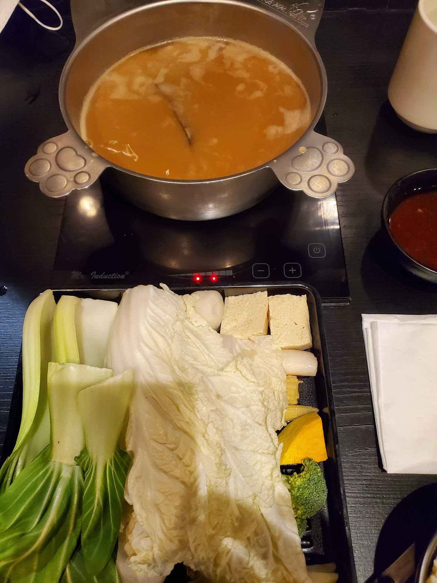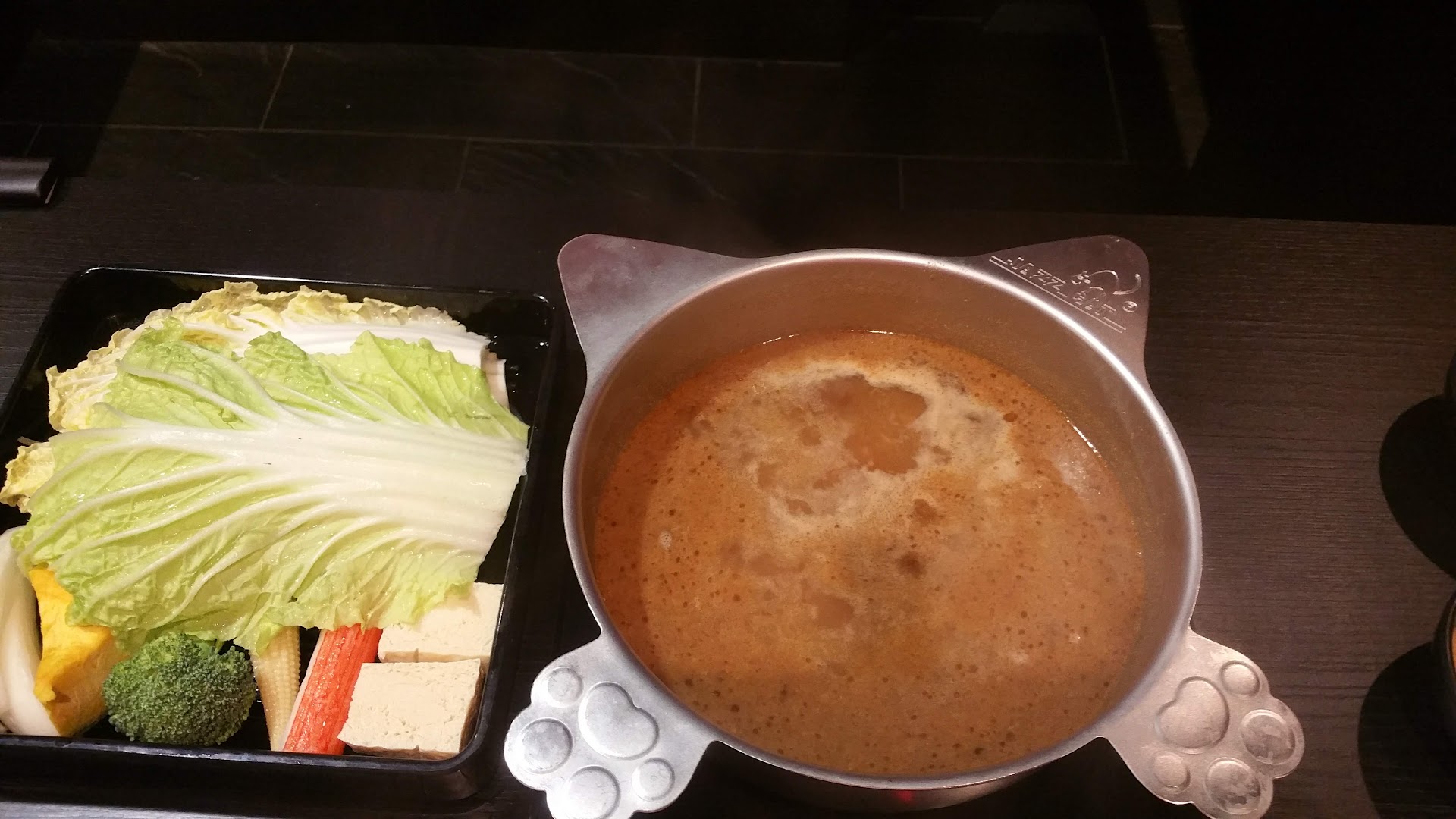 I ordered a premium beef with Taiwan satay broth. It didn't take them too long to bring our orders. I realized they have their own shape of hot pot that is the shape of a cat. That's pretty cute! What I like about this place goes downhill from here. The beef was not really cut for hot pot. They were too thick. They actually became tough once you cook them through. It's like three times the thickness of a normal hot pot beef slice that you could even get in a supermarket. On top of that the vegetable was not even cut to manageable size. I felt like they should give me a scissor so I could cut them myself. Were they that lazy to vegetables?