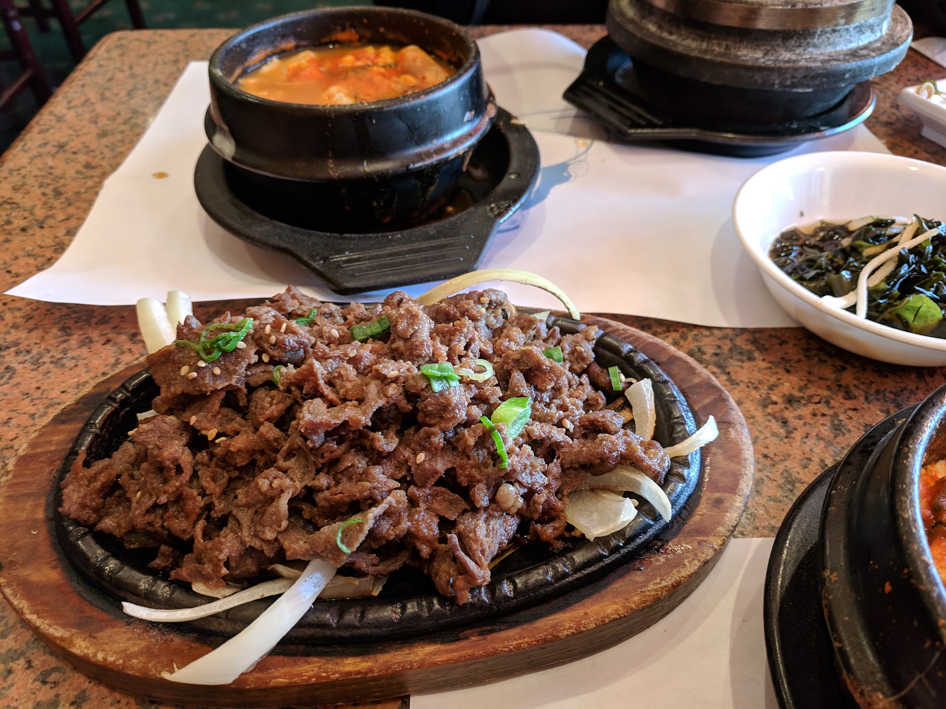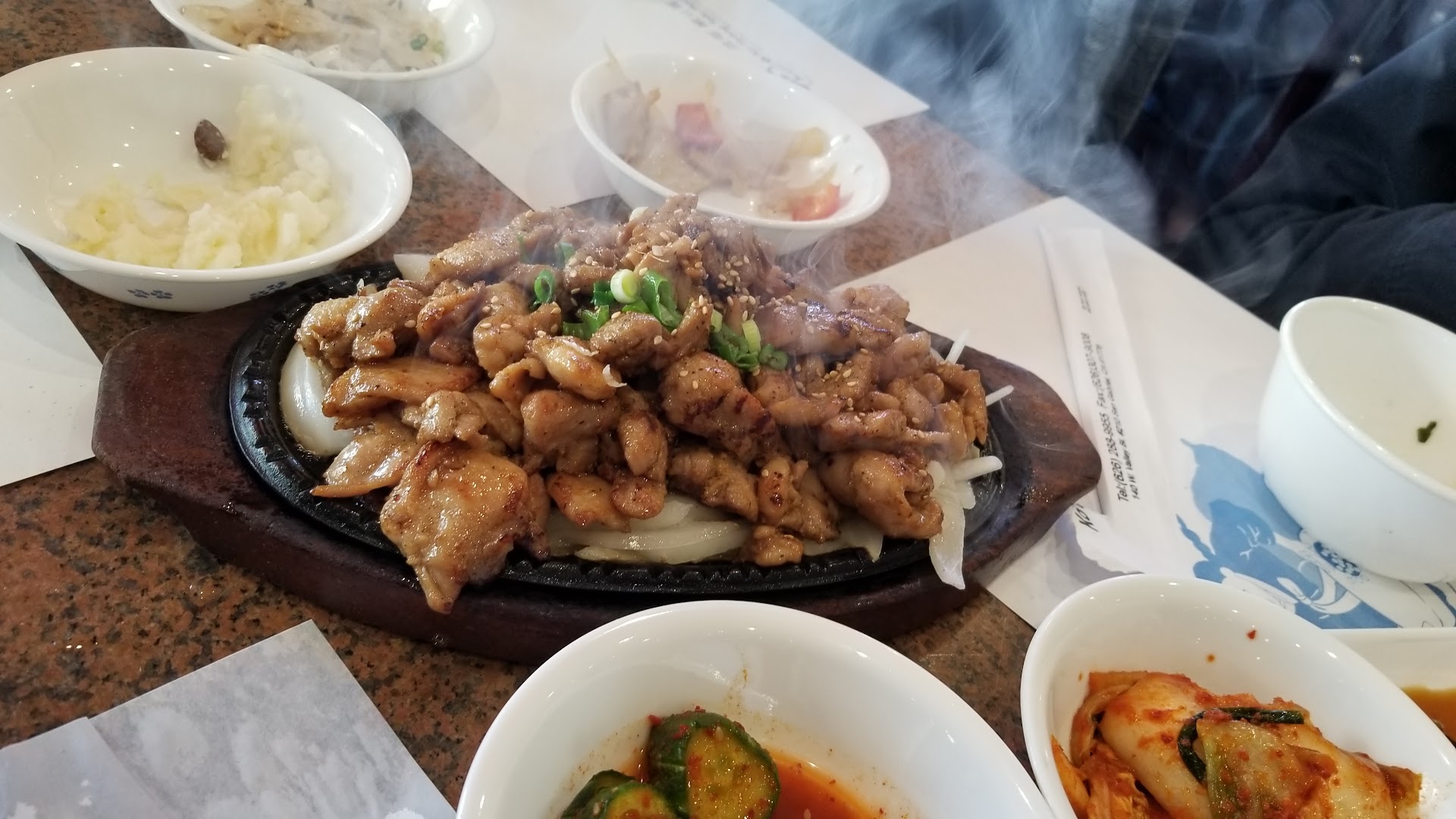 Updated review: They charged us $70+ without giving us any food at all. Extremely horrible service. We went in and gave them our order at 12:15. At around 12:30 they still didn't bring the side dishes. Instead, the two servers were just standing there chatting. I asked them for the side orders, and they said they'll bring it right out. Yet, they brought it out to the other tables first before coming to us. Then, at 12:40, I was worried about not having enough time to eat, so I asked for check and pick it to go. They insisted it'll be out in 5 minutes, so we decided to wait for 5 more minutes. However, at 12:50, the food was still not out! So I told them I want everything to go. They refused to pack the food for us, and just threw a bunch of to go boxes on our table.