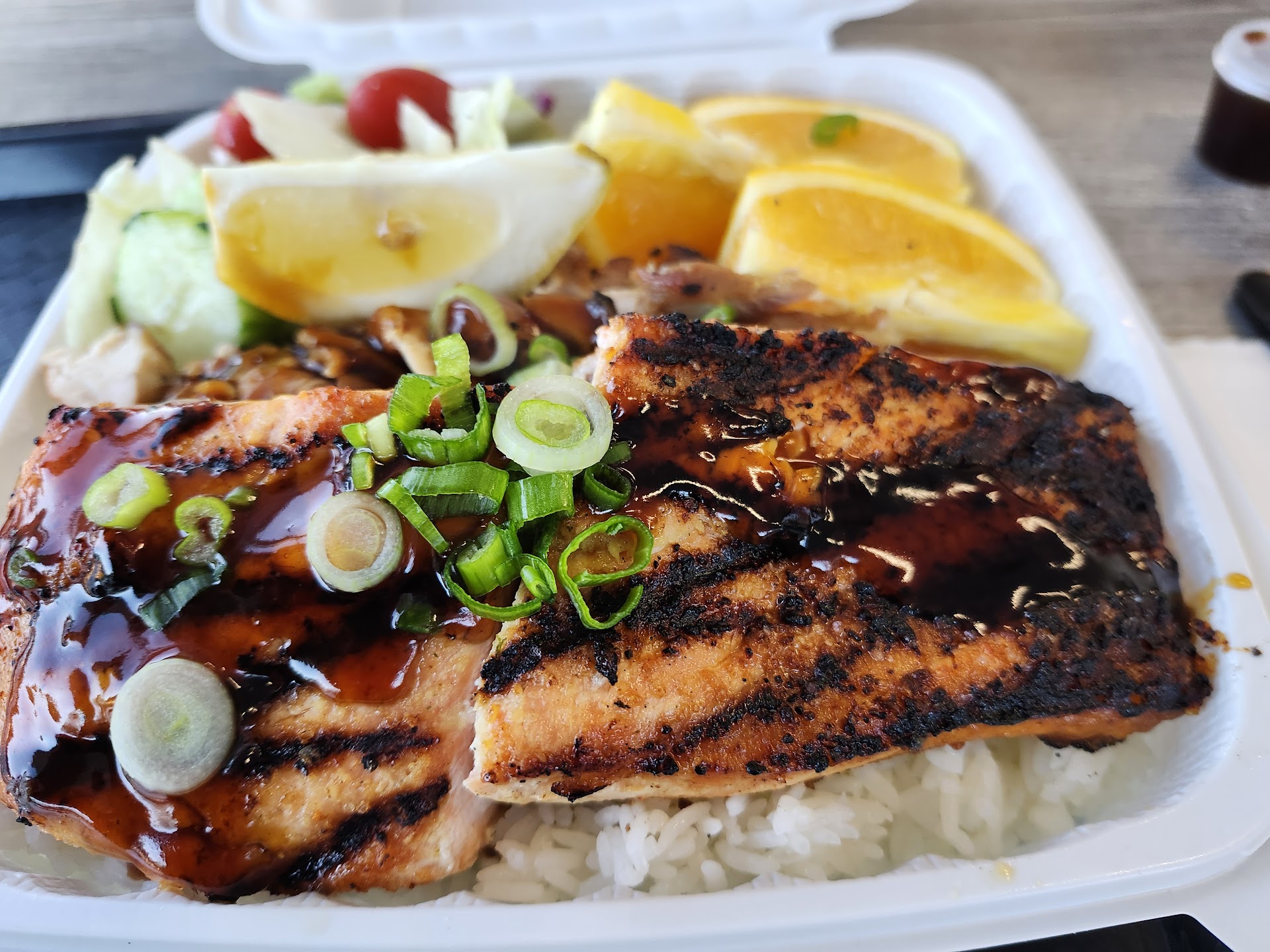 Read moreIt's been crazy hot lately, (even for here) so a lighter lunch sounded pretty attractive. And with my youngest daughter and visiting mother both being vegetarians, the options were limited. So when my oldest daughter suggested Top Grill, we all quickly agreed. I grew up in L.A. loving Yoshinoya so I was looking forward to a rice bowl. Unfortunately, I wasn't the only one. We show up right around the lunch rush and the line was almost out the door and there was nowhere to sit. But a crowded restaurant is a good sign, so we ordered anyway, hoping the place might clear out by the time our food was ready. There was the expected amount of sand people trying to stay cool, and ine was kind enough to trade his larger table for our smaller one. The staff was friendly, but very busy, and they kept the line moving quickly. They were also kind enough to bring the food to our table. We order a salmon rice bowl, a tofu bowl, a chicken beef and veggie bowl and a chicken beef and veggie bowl with brown rice. It was a little expensive, at around 45 bucks, but capitalism gonna capitalize. The food was good, both the chicken and the beef as well as the nutty brown rice. The veggies were welcome but a little lackluster, but the extra sauces made everything tasty. So, it was good, fairly healthy and I liked it, but if I come again, I'd probably just...