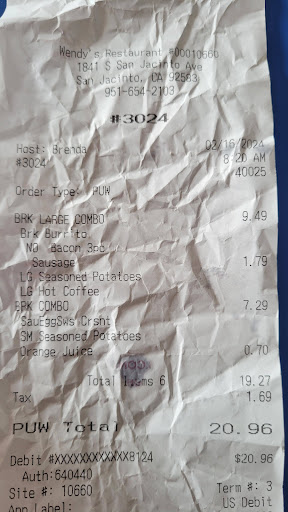 Read moreI have had three bad experiences with the Wendy’s on San Jacinto ca first experience I ordered with door dash and they forgot my husbands burger from his order he got stuck eating just fries and they did not have space in voice mail to call them so I had to drive all the way to the restaurant they replaced burger but did not offer anything at all for inconvenience second time I went I drop up to drive thru ordered fries and burger paid and then after I paid they said actually we are out of fries so had to replace it with other side do again I did not eat. Third time which was right now thru door dash again on receipt it says ranch and ketchup got neither got super brown burnt fries and a jr cheese burger deluxe that I can clearly see is old because bread is cold hard on one side soggy lettuce and meat is super dry and hard this is not what I expect from a resteraunt that I used to get great...