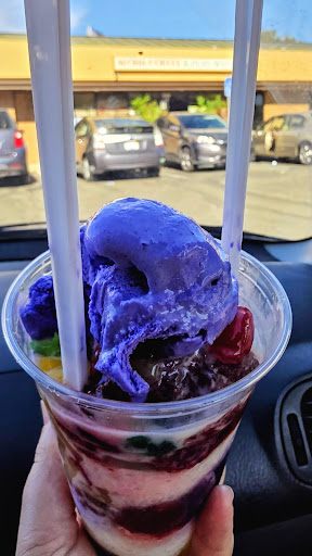They also offer a variety of drinks and cold items. The shave ice is classic and you can add the Hawaiian style with red beans and condensed milk if you'd like. But, I am very partial to their Halo-Halo, a Filipino dessert/merienda. It has all the jellies, beans, Ube halaya, and ice...
