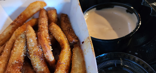 I wonder if this place actually has a manager on site. My first time here. 3:00 on a Wednesday. Walking up to the front door, the entry way is disgusting. So dirty, itâs black and has obviously never been power washed. Walking inside, I donât get the black interior walls, very uninviting. I donât get the interior design. 6 large screen TVâs, none of them were on. Mexican music playing from the kitchen, then switched to hip hop. Small menu which is fine. I ordered one (mild) slider, fries & soda. Waiting for my order, I used the bathroom, smelled bad, a yellow caution âwetâ sign standing in the middle, dirty garbage overflowing. No paper towels, not even a paper towel dispenser or hand dryer! Upon using the self-serve soda machine, literally half of the flavors had âout of orderâ on them. Another yellow caution âwetâ sign next to that. I then had to ask the ONE guy behind the register for a towel to wipe the dirty table down amongst the other dirty tables. Which he volunteered to wipe down for me. Numerous tables were dirty, and the floor really needed to be swept. The slider I ordered was ok, as were the fries. But overall, the place has a vibe that non of the management cares and that trickles down to the employees not caring. I canât believe this is actually a franchise because their is obviously no pride of ownership whatsoever. As I left, looking at the dirty floor and dirty tables that needed tending, I noticed the cash register guy sitting behind the counter staring at his phone. You can also see in the photo, the employees take the best...