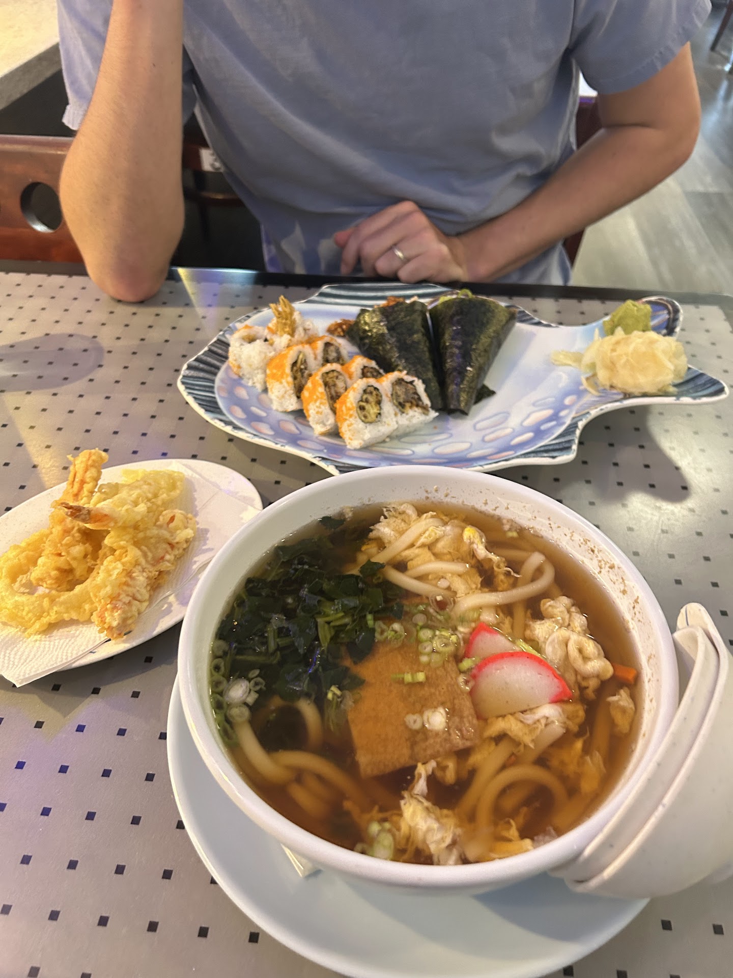 I ordered the tempura udon, while my boyfriend chose two hand rollsâsalmon skin and cooked salmon. We also shared the soft-shell crab roll. The udon was tasty, though I was slightly disappointed by the egg (I was expecting a poached or boiled one). That said, the tempura was a nice surprise, featuring imitation crab, carrot, and shrimp rather than just the usual shrimp. My boyfriend enjoyed his cooked salmon roll but wasnât a fan of the salmon skin one. The highlight of our meal was definitely the soft-shell crab rollâfresh and flavorful, it really made the...