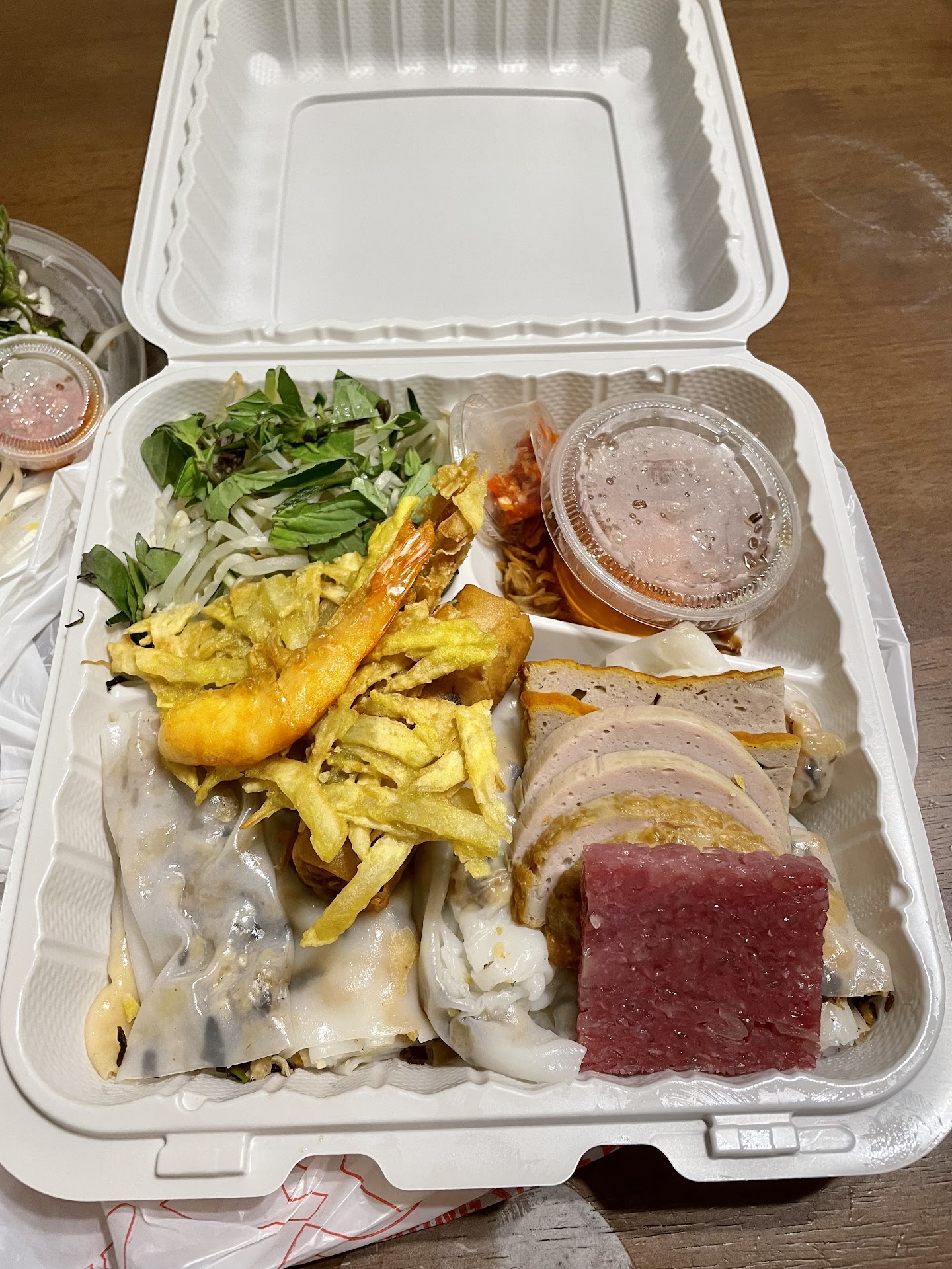 Ordered to go #1 special Bánh Cuốn Đặc Biệt – which had delicate chew, juicy bits of pork and veggies giving a burst of flavor accompanied with fresh bean sprouts, mint, herbs and other sides, all meant to be dipped or drizzled in a prepared savory fish sauce (add on chili sauce and fried shallots for umami)