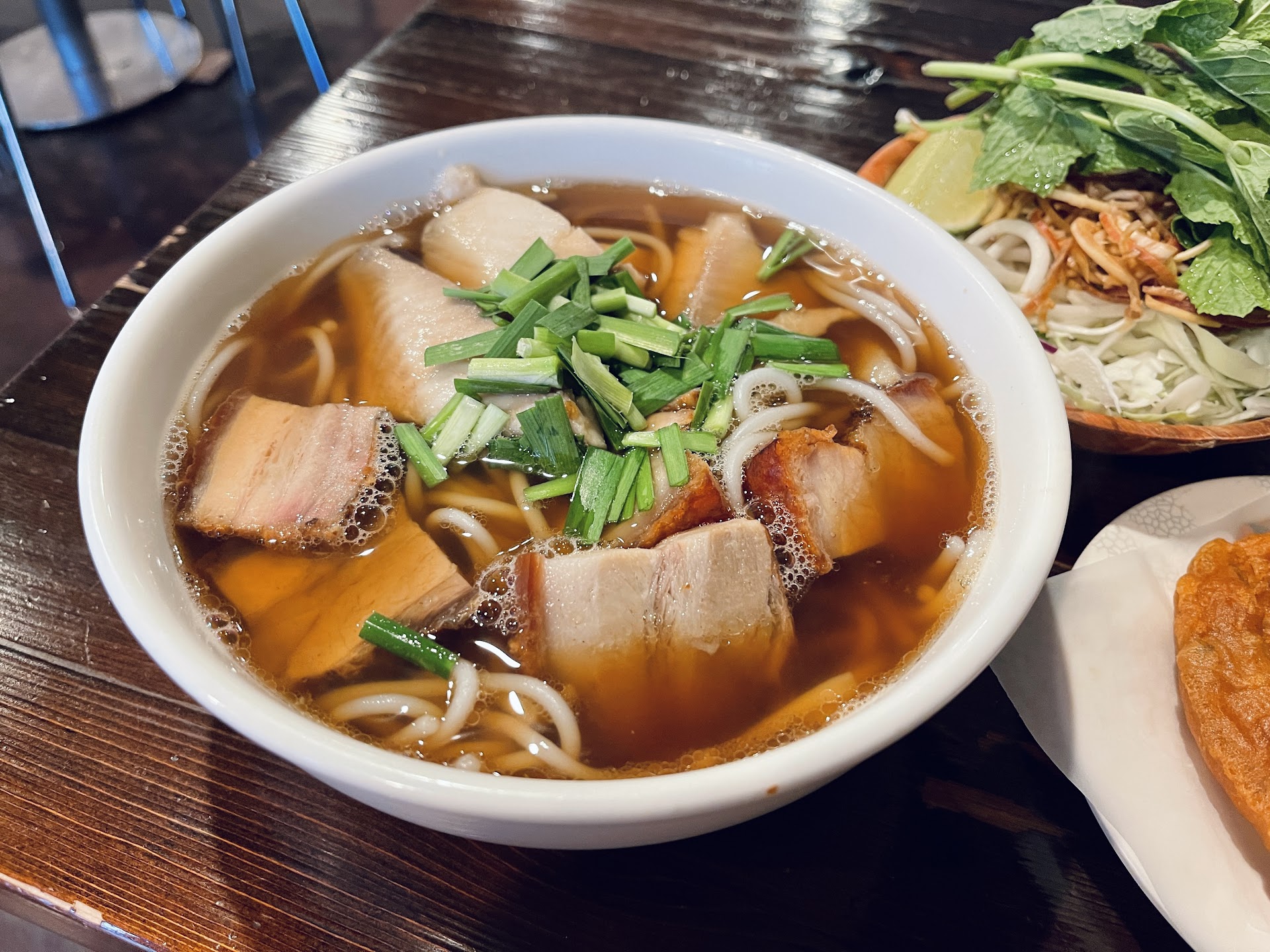 Starting with their portion. I ordered a small bowl but it filled me up! The portion was so generous and full of delicious roasted pork's, 2 full-size fish fillets, squid slices, 2 full with-head-on jumbo shrimps and lots of garlic chives which I love. The soup has the right balance of sweetness from all the seafood goodies and the saltiness from the fermented fish. I drank my soup clean LOL. If you're not Vietnamese, the smell of the fermented fish may repulse you. However, I encourage you to give it a try as Bún Mắm here is as authentic as what you can get from Vietnam.