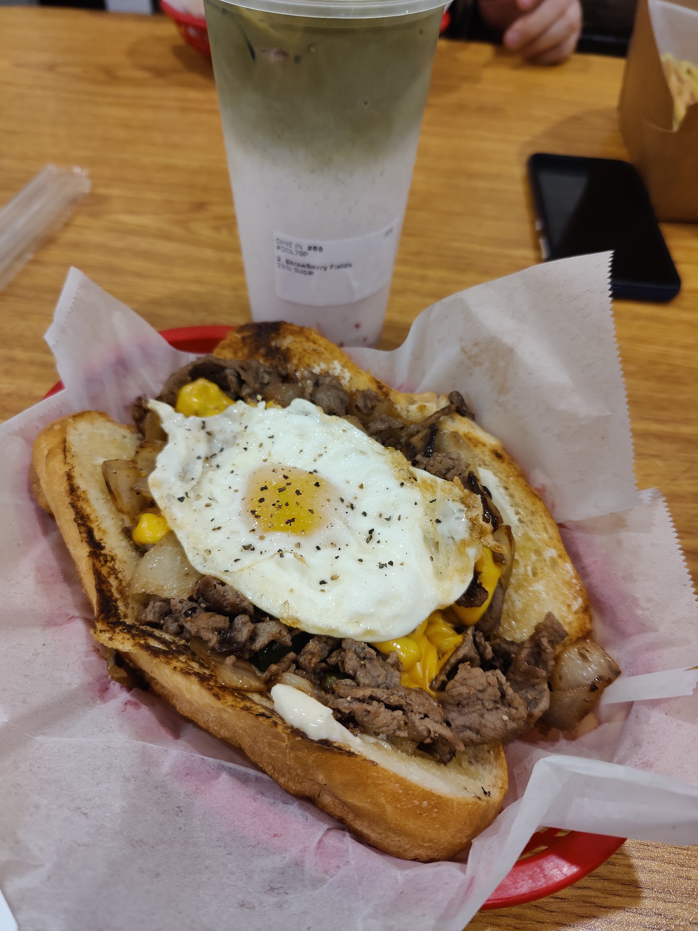 Food is ok. I do wish they made just an old fashioned cheese steak as I remember, steak, bell peppers, onions, cheese, I don't even think there was mayo on it. But they don't.