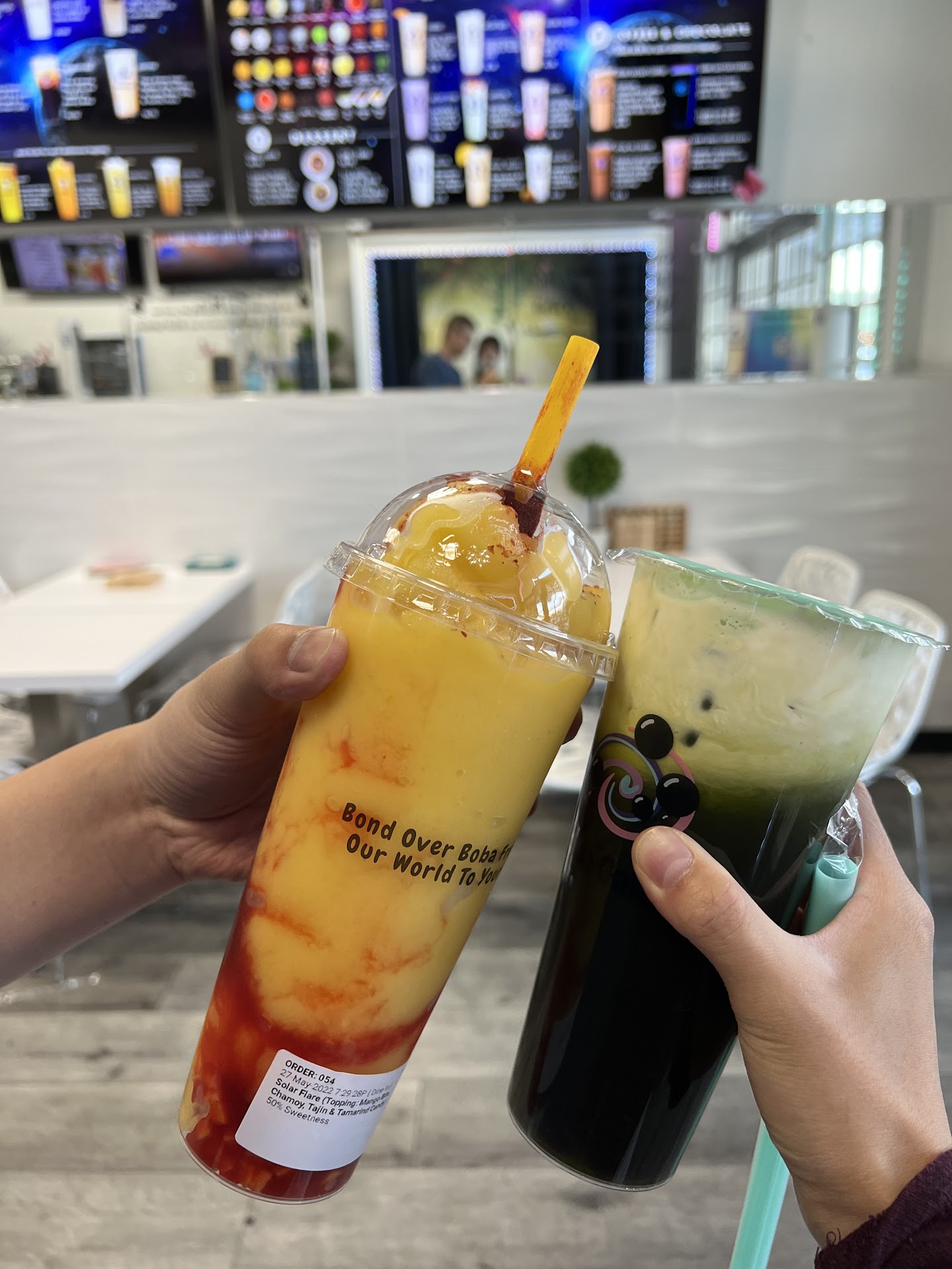 I ordered 2 drinks: Solar flare (10/10). This drink resembles the mangonada that I had in LA. Fresh mango smoothie, chamoy, chili, and small chunks of green mango at the bottom. It was so refreshing to drink and the straw was fun to eat! My only complaint is that the straw broke very quickly and we had to improvise.
