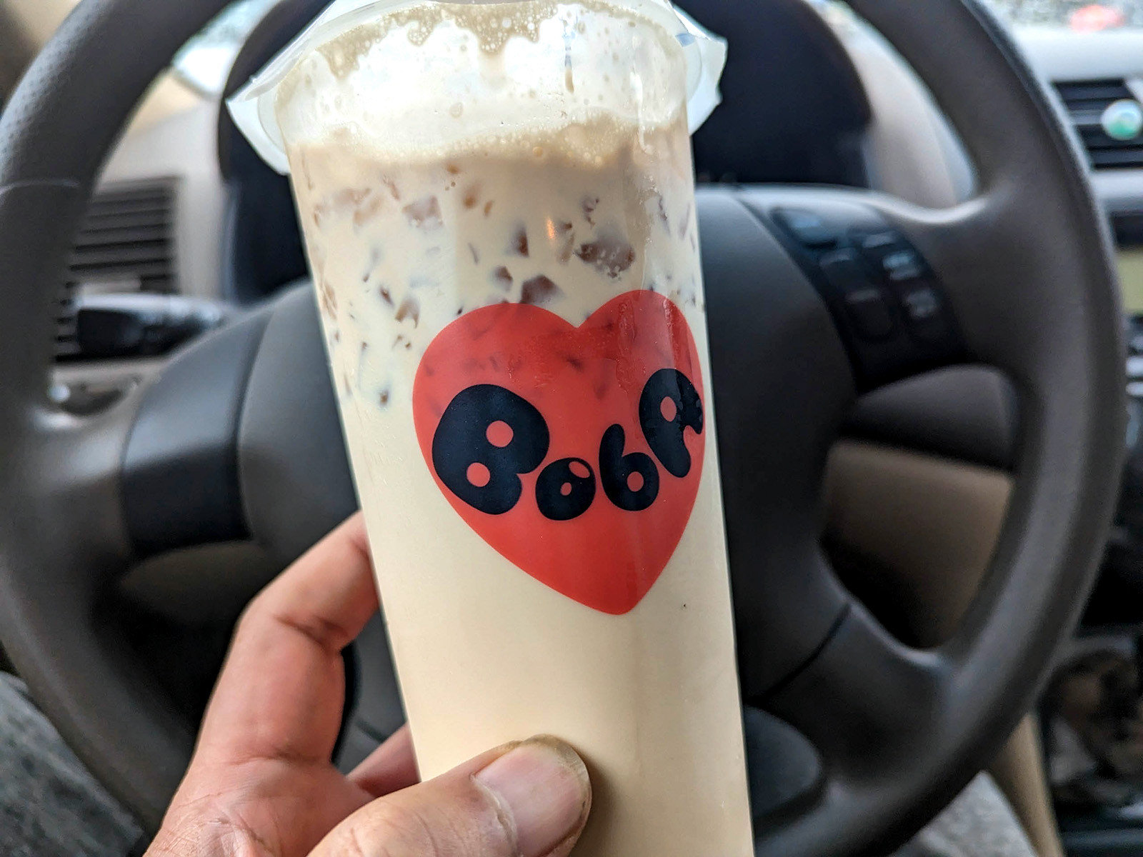 Read moreIt felt like I was in a weird Vietnamese hipster nightclub during day lounge that served boba. There was this soft couch with a neon sign on the wall. Christmas green and red lasers were shooting toward the back wall at the 3 foot pink Christmas tree. I'm not sure how safe that is because my eyeball was in the path of those lasers while waiting for my milk tea $6.50. The staff was nice. The older women was eating this shelled shrimp dish with her hands on the cashier counter. Luckily the younger teen helped me with my order and made my milk tea. The tea was not as fragrant as I would have liked. Perhaps I took some edge off because I asked for unsweetened. Still, good milk tea. More tea, less milk would have...