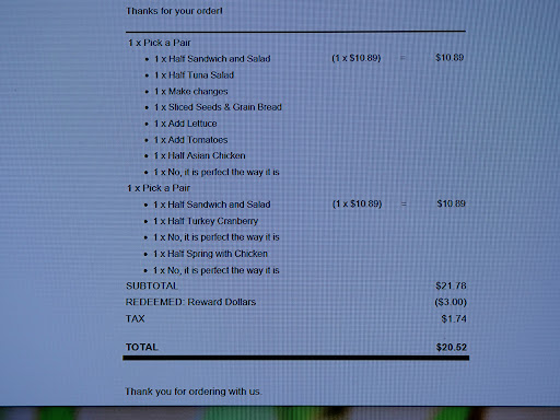 My GF and I usually order a pick-a-pair for each of us. For example, tonight my GF ordered a 1/2 Spring salad and a 1/2 turkey cranberry sandwich for one combo, and I ordered a 1/2 Chinese chicken salad and 1/2 tuna salad sandwich on the other.