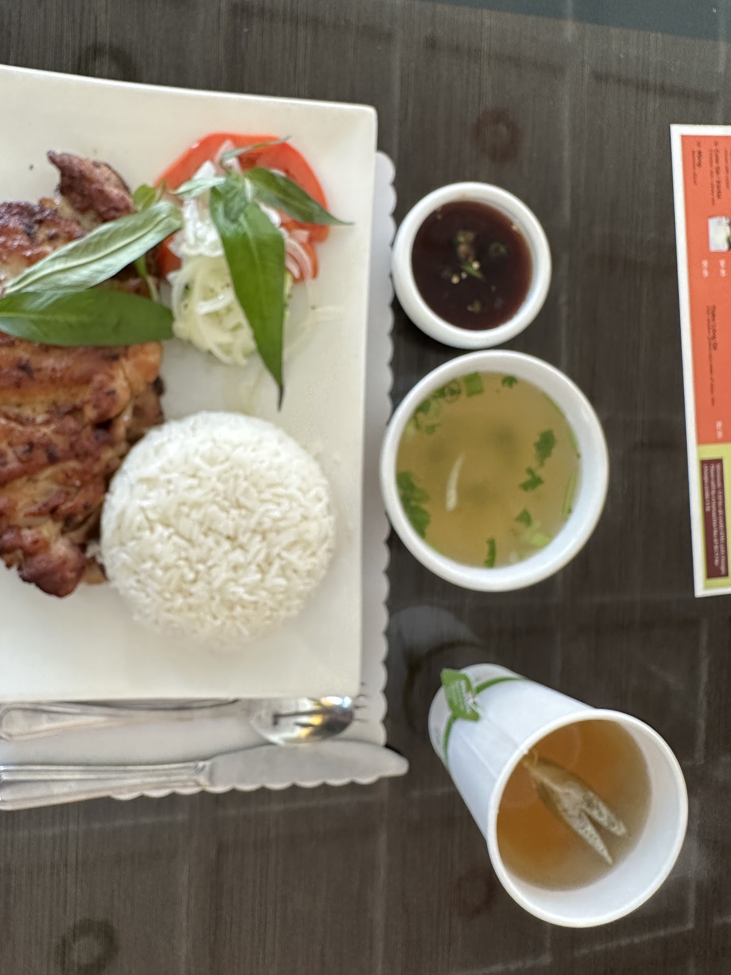 He recommended the grilled chicken, rice and soup. The dark sauce was very tasty. The soup was flavorless. The mini salad didn’t look very good quality so I didn’t even bother. Tea was very good. Jasmine green tea. Overall I would not come back here for any reason.