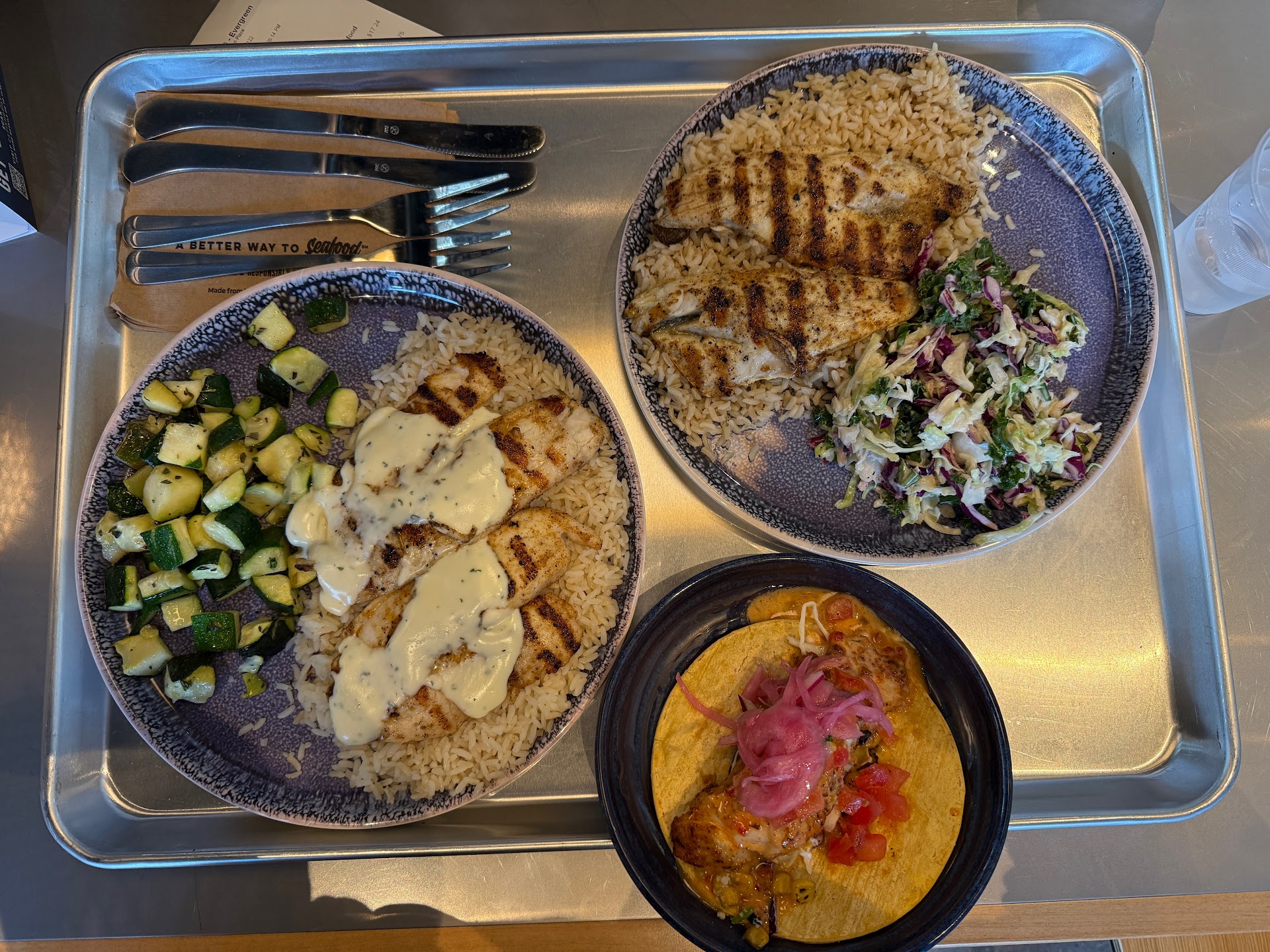 You will not find a better fish deal than here. Basically $12-$20 for a grilled fish with side. And our tilapia and branzino were pretty good. Garlic butter sauce is best for me, but I realize it has more calories than cajun rub or olive oil. The rice is good and I also like the zucchini with rosemary. Fish taco was very good!