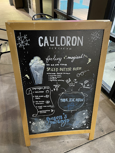 Cauldron reminds of "dinner and a show" You get entertainment watching the process of pouring the fresh, homeade liquid ingredients into each bowl, then watch interactvely as they pump the bowl with liquid nitrogen, then finish with a pattern on top of your ice cream and toppings.