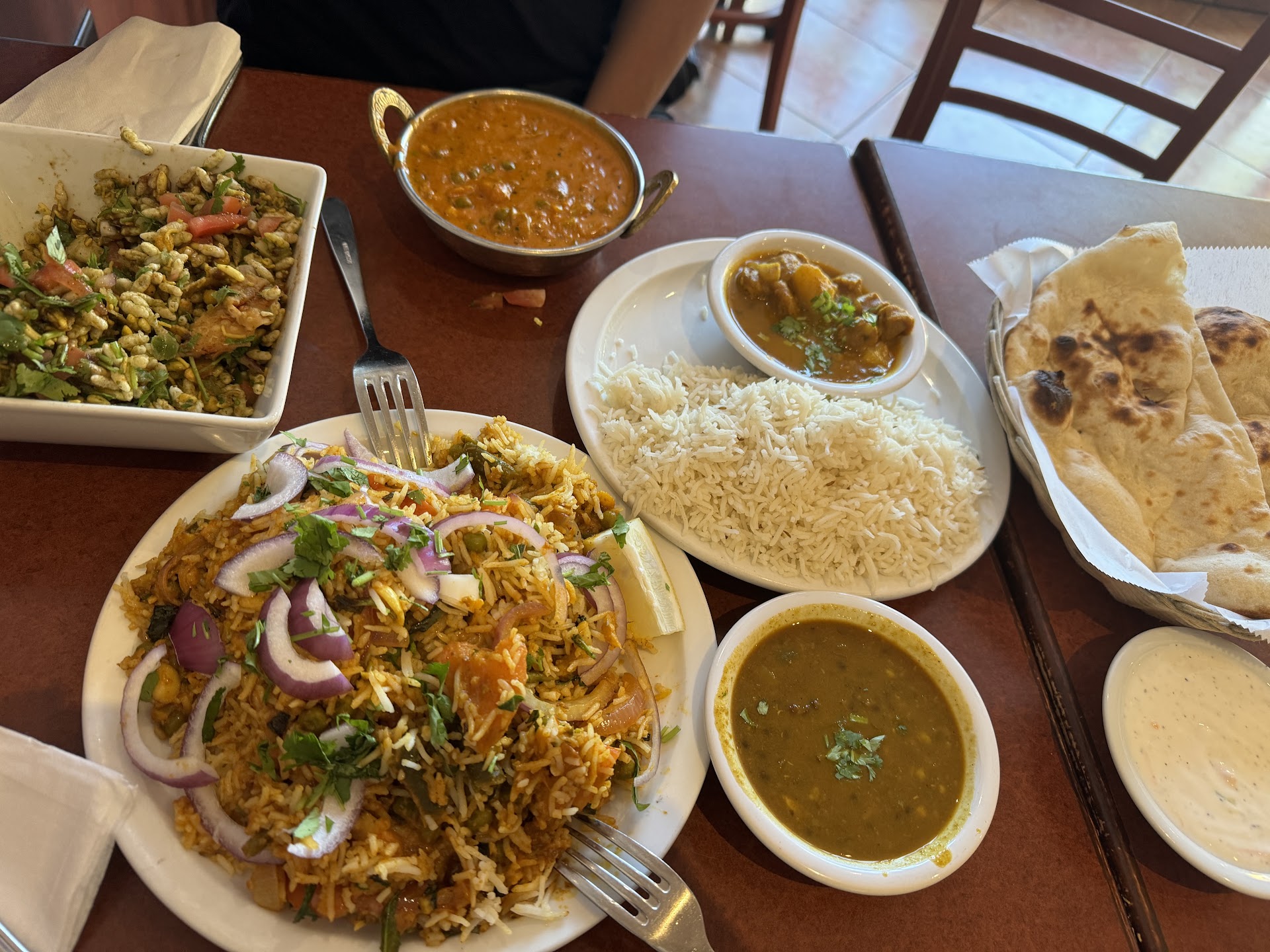 Food starting arriving pretty soon- one at a time. Much of it was served warm. The sweet lassi is hard to screw up and they didnt. The aloo paratha can with raitha- nice and warm and not spicy as requested. For once, someone who gets a kid specific request. The wife felt that the papdi chaat was a tad bland which was corrected with the a couple of the amply available small cups of tamarind and date chutney and a spicier mint chutney. I was a tad disappointed with the samosa chaat- it was too salty and spicy and had much too much chana. The paneer pakoras came in hot and again- thankfully not too spicy and kid friendly. Overall, we liked the place. We know what to specifically ask for the next time around. And there was nothing that would make us not want to come here again. A definitely acceptable local alternative for chaat when the...