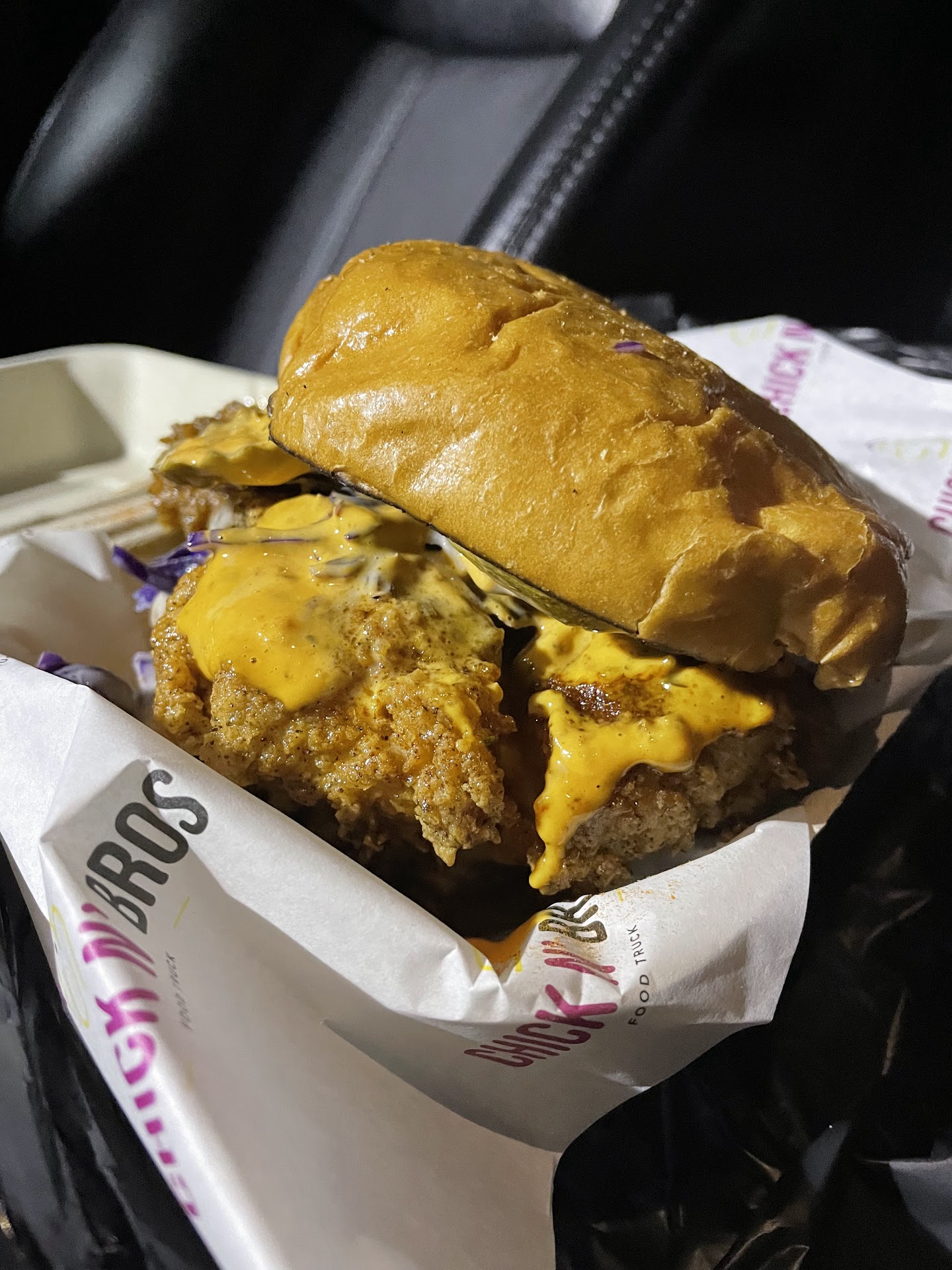 Nashville Hot chicken sandwiches is still trending in the Bay Area and I was finally able to try a very popular food truck in the South Bay @ChicknBros.SJ. They offer four different sandwiches and along with two different types of tenders and sides. They really allow you to customize your sandwich to your heart's desire. They have options from the ingredients in the sandwich to how you want your sauces on the buns or on the side. I got the Angry Bird deluxe, which is a Beer battered fried chicken, orange spicy adobo aioli sauce (Bro Sauce), white sweet and tangy sauce (Chick Sauce), purple cabbage, onion, pickles, local honey, brioche bun with level one spiciness, Cayenne. They offer five different levels of spiciness. I have glad I choose level one because I could handle it and it was perfect for my tasting. If you are adventurous, level three or above would be great for you. I love how crispy and tender the chicken was. The purple cabbage along with onions and pickles added so much depth to the sandwich. This is first place that I have been to that puts honey on the chicken, which was good and unique. The bread was soft and toasted, which was a perfect complement to the sandwich. What impressed me the most was the ordering system, which allowed you to order in advance and and set your pick up time based on availability. Once you get to the truck, it will only take about ten minutes to make. At one point, people would wait an hour plus for these sandwiches. They are located in front of a Hype Beast shoe store, Kickz, so you can check them out while you wait. I really enjoyed this sandwich and can not wait to come back to try the tenders. @ChicknBros.SJ