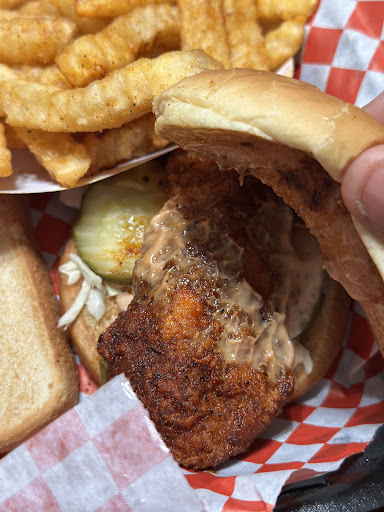 Read moreWhenever I travel, I always look for breweries, hot chicken, and playgrounds in the area(for my kids). I do love me some hot chicken, having done the Hot Ones challenge a few dozen times! I’ve learned to begin with the second hottest level of spice rather than be surprised with a. Sandwich that is hot but has no flavor. I was pleasantly surprised as their second level of hot had a very good flavor. I enjoyed the sandwich and fries as well. Service was friendly and reasonably fast, despite them being fairly busy. The restroom was clean and their prices pretty much match the market. Probably the best value on the menu is their #4, which is two sandwiches and fries, which is $18 or so. Not bad for a couple. It doesn’t include a drink, but a single sandwich meal is around $14. My only complaint is that a few places give you two chicken tenders per sandwich, or a large chicken breast. This was a single tender that didn’t completely ‘fill’ the bun. But otherwise very enjoyable. The biggest question when eating spicy food is how were things the next day. While I knew exactly what was taking leave of me, it wasn’t the incredibly uncomfortable exit a lot of hot chicken lovers tend to experience. 😬 Also, while they offer high chairs, their fries are seasoned, and while not necessarily hot, your kids may...
