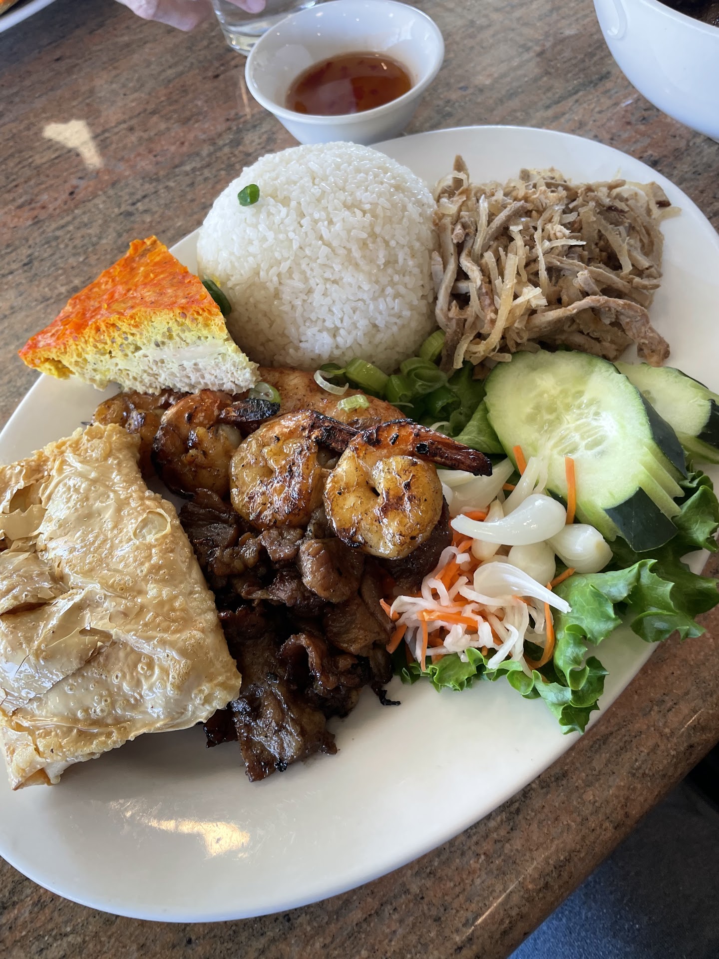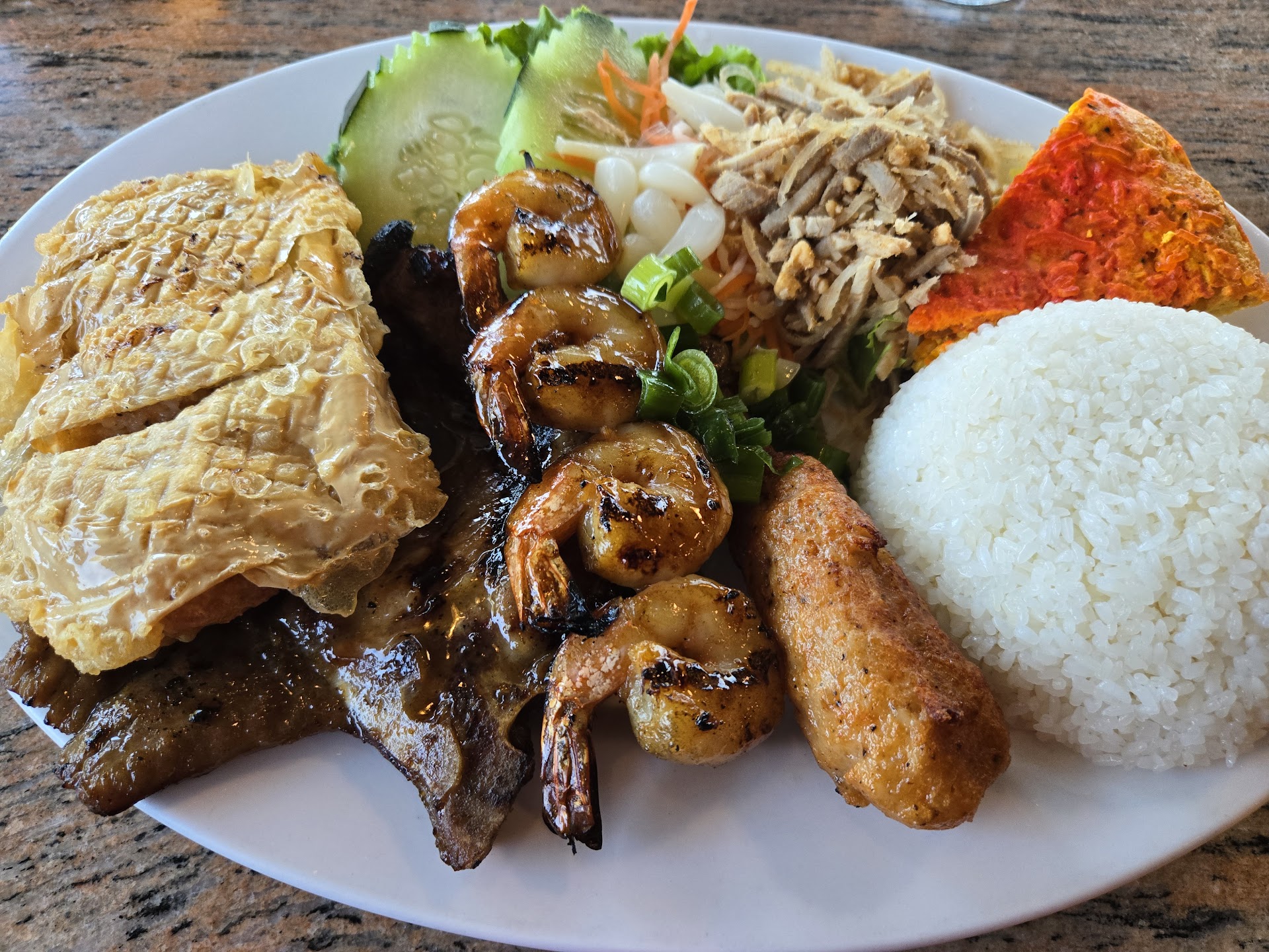 They have all the combination of broken rice dishes you could every want! Tried #7, #59, and their egg rolls. The plates came with beef ribs, fried shrimp cake, grilled shrimp, veggies, soup, and #7 included extra items like the sugarcane shrimp, shredded pork skin, and egg cake. The flavor of the beef was delicious, and their fried shrimp cake is huge and well made. Despite getting it to go, when I got home to eat it it was still nice and crispy!