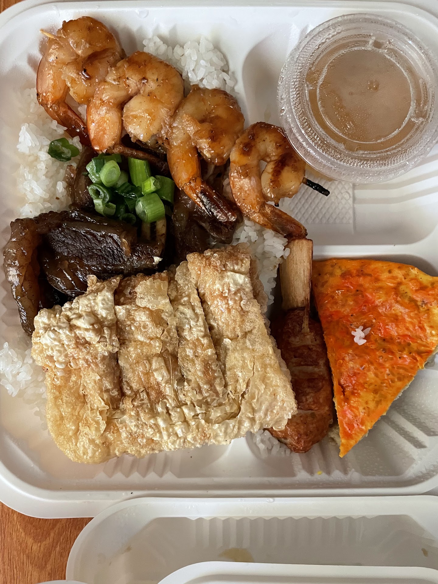 The rice plate was delicious, everything was well executed. The pork was slightly on the sweet side, but packed with flavor. It had a nice charred BBQ taste to it. The egg cake was fluffy and had a light taste paired with the sauce was great. The BBQ shrimp was cooked perfect still juicy with a plump texture. The marinated had a sweetness to it and the grill gave it a nice hint of smoky char. The fried Shrimp Cake light and crispy, full of flavor, on the savory side. Grilled Shrimp meat on Sugar was savory. The shredded pork was okay, I could do without it. I didn't try asking for substitute, but next time I would try substituting for BBQ pork instead. It also comes with soup, it was a nice palate cleanser, very strong and savory flavor. The dish did a good job at balancing the sweet and savory flavors. (5 out of 5)