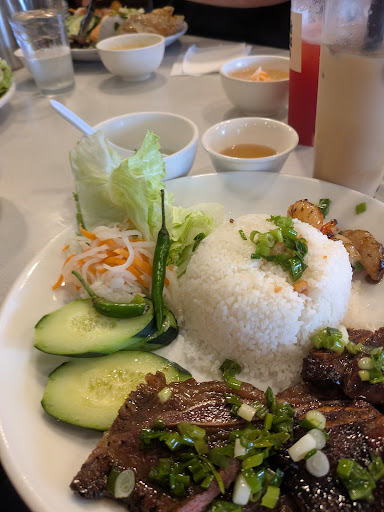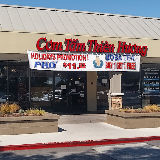 Read moreWhen you're outside in this plaza, you might be wondering what all the big smoke is that pillows the parking lot once every 5 minutes. Its mostly coming from here which somehow is a pretty effective advertisement if i say so myself! When you walk in however, you could be asked to wait as this restaurant specializing in com tam rice plates is pretty popular in the area. (And the 3rd business i seen with thien huong on their name, is this just a really diverse family of restaurants?) Once you get seated however, its A pretty nice lively atmosphere with modern design elements and materials used from the ceiling to the tables! I also like how they incorporated some TVs showcasing their menu items such as their $7 boba... But look on their very simple paper menu and there's a lot of choices involved, however, unfortunately there's no orange rice that could see which was a shame. There is also pho offered. I highly recommend you take any dish with the korean short ribs and shrimp as those were my favorite, there are some other options, including a bean curd wrapped shrimp and fish cake. Each dish also comes with salad and chicken soup which was very nice. The ordering was very easy and the server understands which number that you want to order. Overall, its a pretty nice and wouldn't mind coming back to...