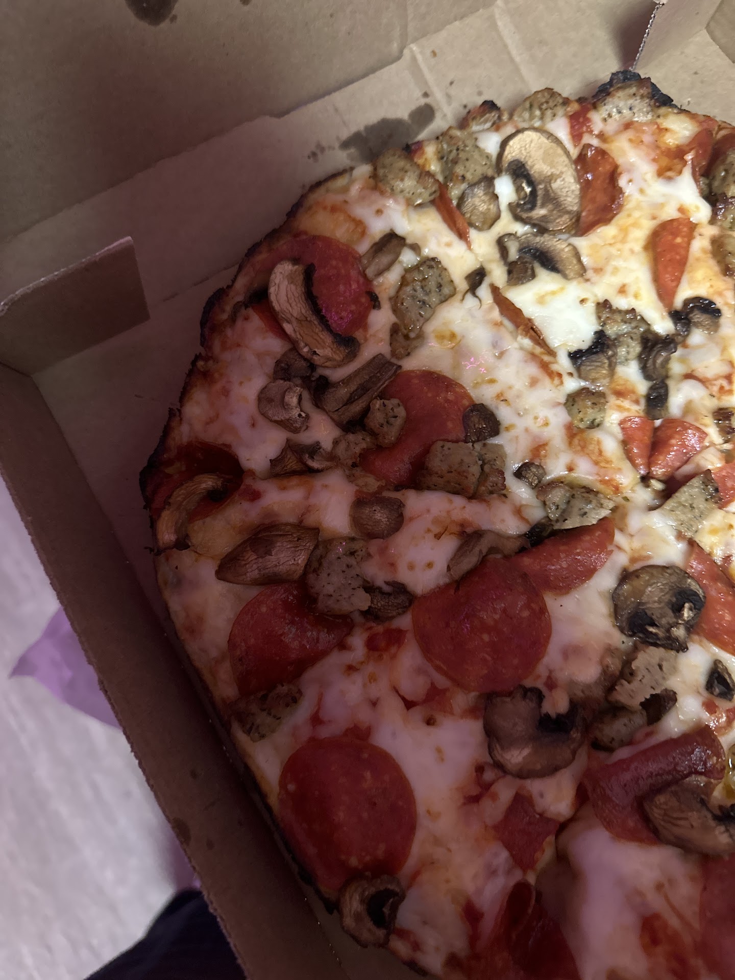 At home now trying out the veggie pizza I customized and it was good! There is something about dominoes that stands out from other pizza places. I mean I've worked at Papa John's, and just like Papa John's, Dominoes definitely has their unique taste. One thing I may add was that the under-dough of the veggie pizza was a bit hard rendering a chewy feeling, but hearing from my roommates who tried out second pizza, it was just the veggie pizza that the texture.
