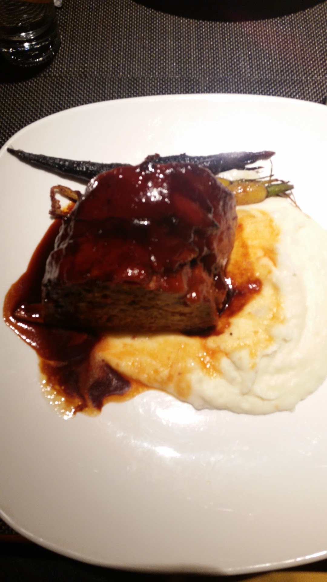 Came here to celebrate my dad's birthday on a Tuesday night. We made a reservation for 5 but it was rather empty. This is my only complaint about my meal here: We were seated at a booth towards the back of the restaurant. Once we got to the booth, my brother helped his gf take off her coat. He struggled a little bit and I watched as the hostess ROLLED HER EYES and then gave off a fake little smile and laugh. I thought that was a bit rude. I guess she was getting impatient with them but to roll her eyes at them is kinda unacceptable. And that's where my complaints end about the service because our server, Chad, was AWESOME! He explained everything on the menu very well and gave us his recommendations since he knew it was our first time there. He was very attentive and checked on us every so often to make sure everything was 100%. Chad made our visit very pleasurable. It's been a while since we've gotten service like that. Cocktails: I ordered the blood orange cosmopolitan and it was so good that I ordered round 2 of the same thing. You can tell they didn't try to trick you with the alcohol because the second one I had had a very strong alcohol taste. It was delicious though and I made a very smart choice. My dad ordered the California Sidecar and it was also very good for whiskey lovers. Chad even burnt the orange peel at our table to show his finesse. Their Moscow Mule is supposedly the 2nd best in the city so I will have to try that next time I am here. I thought the coolest thing about their cocktail menu was that everything was made in California, all the beer was Cali brewed, all the wines were from Cali. It was pretty cool. Now for the food: Appetizers: We ordered the deviled eggs with bacon, the crab cakes, and the chicken wings. The winner of the three were the chicken wings. They were smoked instead of spiced and it gave them a unique flavor that you can't find anywhere else. You can skip the deviled eggs, they weren't special and didn't have as much flavor as I had hoped. The crab cakes were pretty good, and came with some arugula on the side. They were pretty flavorful and I really liked them but they were a bit pricey. Entrees: I think the winner at our table was their RIBS. They were spicy but they were also very flavorful and juicy. Definitely the best ribs I've found in the Bay Area. I ordered the Dry Creek Meatloaf and it was a HUGE portion. I was surprised when I was able to finish it all but it was also very good. The bacon that was wrapped around it made it the best. Dessert: We got a complimentary dessert for my dads bday which was cheesecake which apparently was tasty. I ordered the apple crisp on the side and it wasn't anything special. I think I would pass on it next time. Overall: Chad made our visit the best. I loved their food and their cocktail menu. I loved the ambience and environment as well. We will definitely be back, as long as Chad...