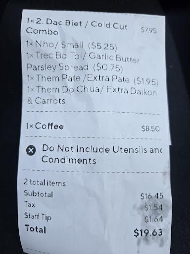 Read moreFirst timer, I ordered ahead for pick up. I walked in there was one line, didnt see no sign for pick up orders, so I went up to the cashier and asked where do I pick up online orders, idk if she didnt hear me but repeated myself and she rudely said just stand there so I was like ok. 3min later she waves a young girl, im assuming to help me she approaches me very nice told her my name gives me my order, I go to my car I open it, immediately notice no garlic spread,my order was a small cold combo with butter parsley spread, extra pate, extra daikons and carrots, so went back cause i mean come on we pay extra, as im walking back I notice there was a window for pick up orders not sure why the cashier didnt mention that instead had me just stand there, go to the window she apologizes I was thinking they were going to re make it but no she takes it back goes to the kitchen, brings me the same sanwhich with the spread! And it was cold not even toasted like what?? So imagine how butter gets when its cold yes! So at this point I was like what ever then I see no extra pate nor daikons with carrots, very disappointed, I really tried to like this place base on the hype but nope, maybe ill try again another day or a...