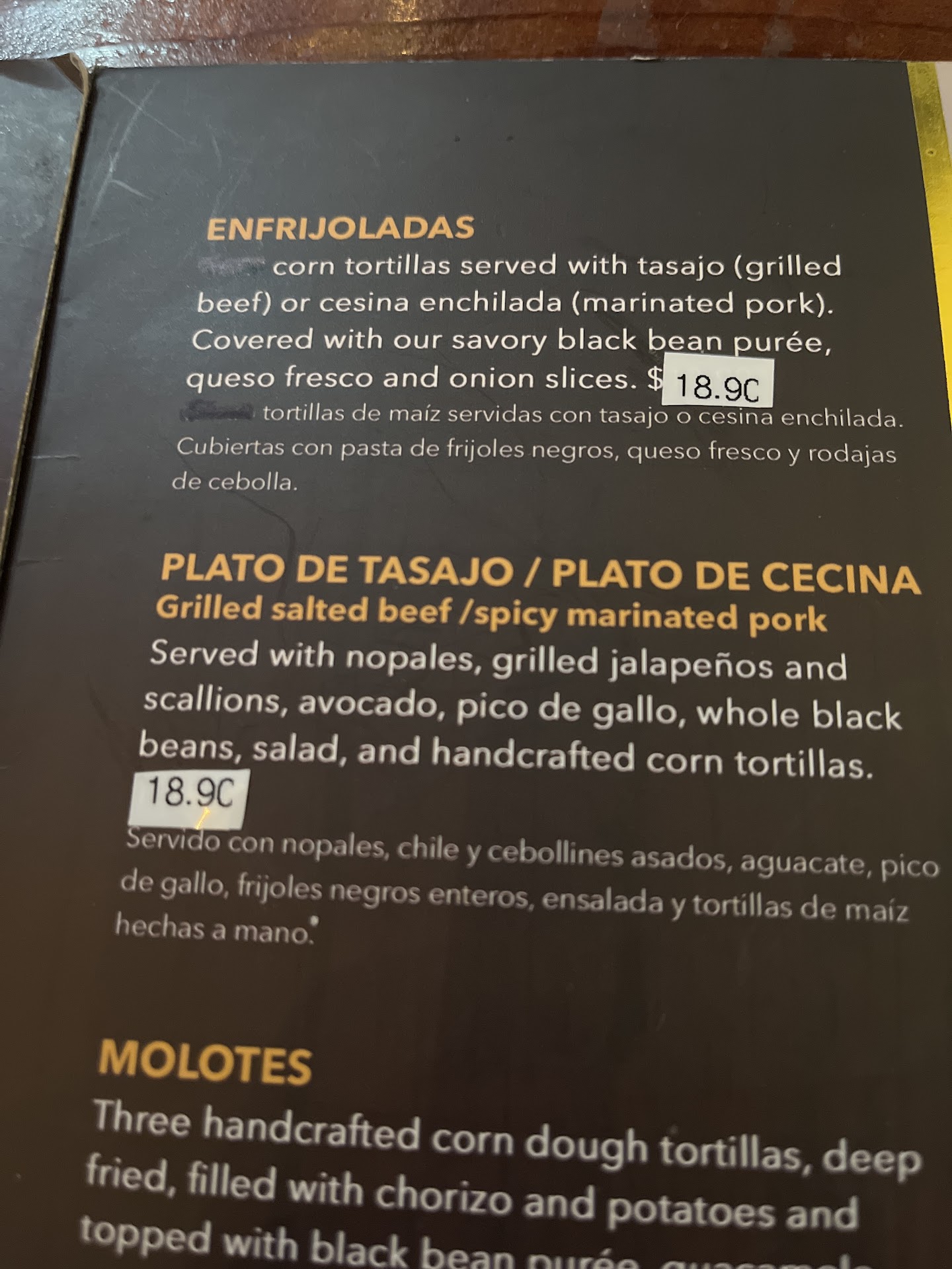 Read moreMy parents were born and raised in Oaxaca. They haven’t been back in years, so naturally they were excited to try this place. Upon receiving the menu’s we noticed that there were new prices placed above the previous ones with simple stickers. The menu my mom got coincidentally had a sticker removed for one of the items … they had raised the price by $5. They even blacked out the number of tortillas you get .. which is 3. The price change would've been understandable had the food been good. everything from the meat (we got both Tasajo and Cecina) to the mole were overly salty. wouldn’t be surprised if they sprinkled salt into the hot chocolate. disappointing that this gets passed as authentic oaxaqueño cuisine, those who are trying it for the first time will have a tainted experience. the people were nice...
