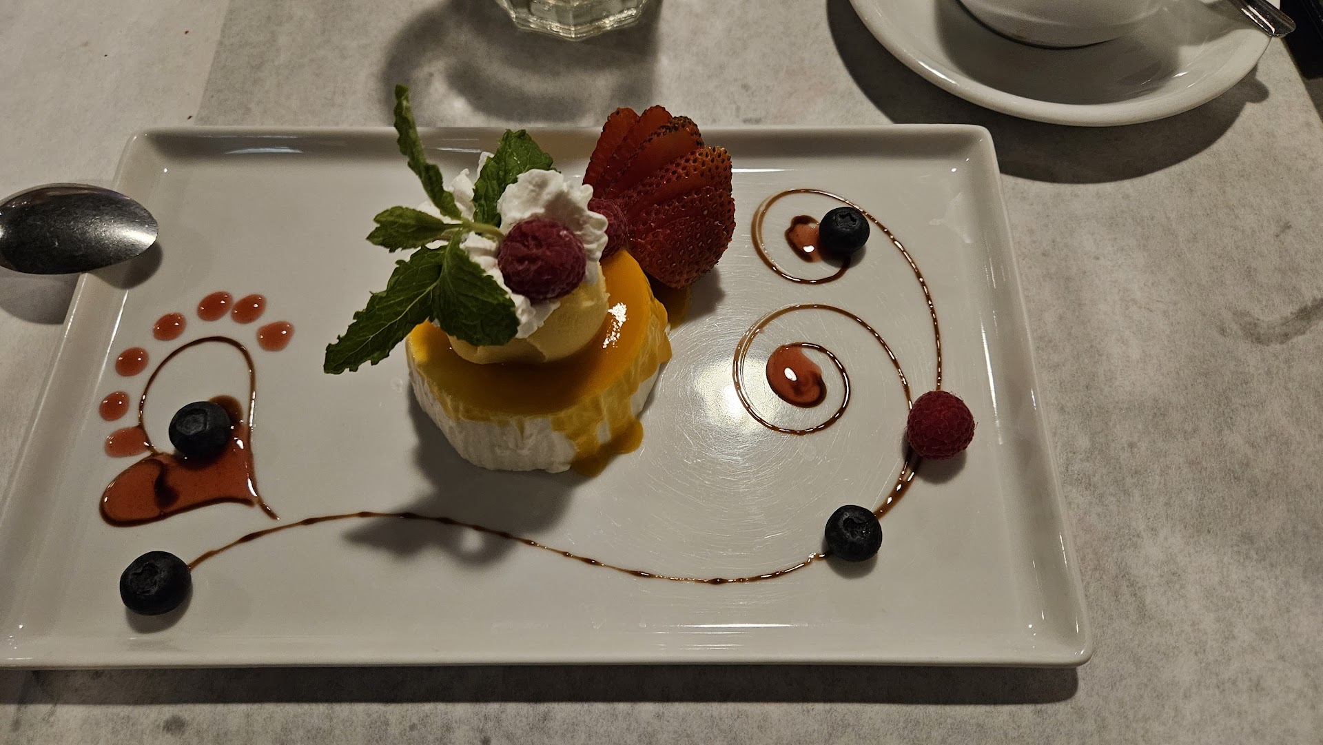 For dessert, we split the mango panacotta, which had a dollop of sorbet on top with some berries. That was fine; nothing to write home about.