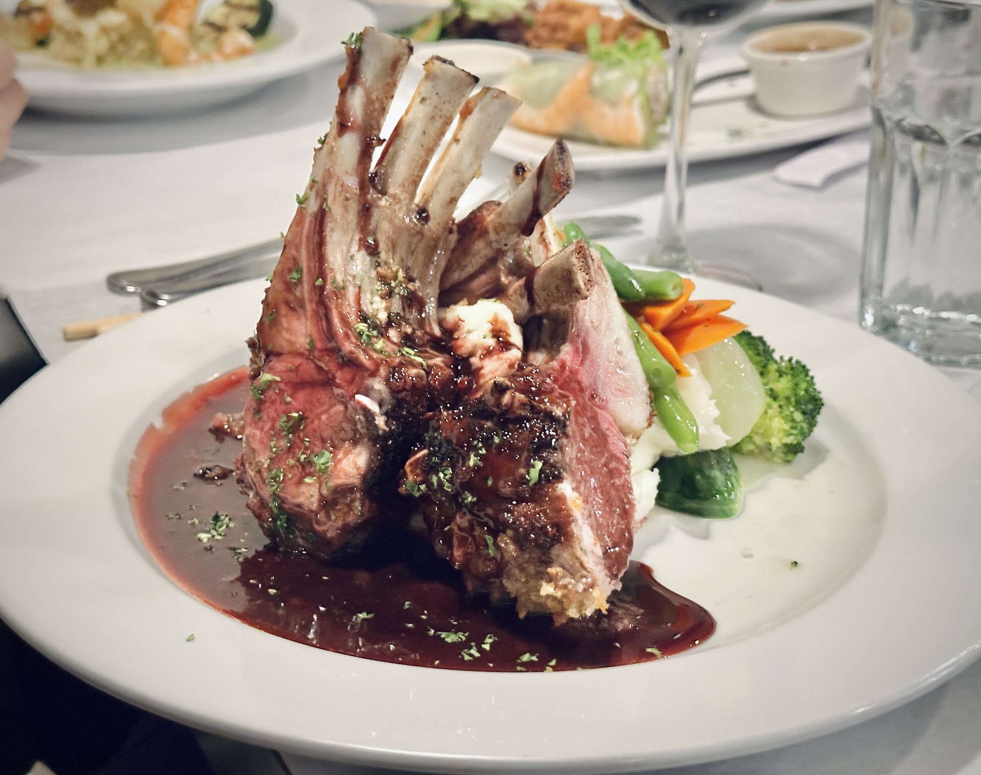 For entrees, each person at our table ordered a different dish. I ordered the Salmon Wellington, which was nicely breaded, in a plate of cream. There was a thick cheese inside the breading surrounding the perfectly cooked salmon. I tried the Australian rack of lamb, also well cooked and seasoned.
