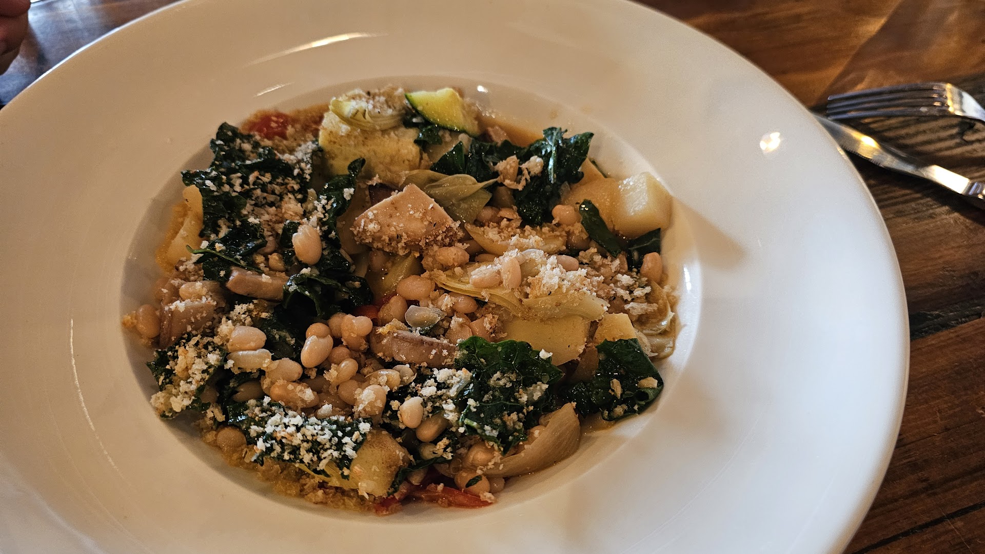 Food: Due to an unusually long wait time (even though we were literally the only table at the restaurant at 6:00 on a Wednesday), they graciously brought out a free jackfruit salad. This was quite tasty and was a refreshingly good start to the meal. Our table also ordered the crispy brussels which were also very good. I as the vegan was really excited for some vegan Vietnamese food and the menu online noted I multiple options that are no longer available unfortunately. My only entree option was a cassoulet which was good, but nothing mind blowing. Without any form of plant-based protein, it was more a bean stew that really needed a kick of pepper or something to bring it out of averageness. Compared to the apps, it was very boring. The two omni's enjoyed their food as more so. If I was rating this solely on a vegan's perspective, I would probably say the food is around 3-3.5 stars, but with the omni's enjoying their food, I bumped it up to a solid 4: Good, but not great.