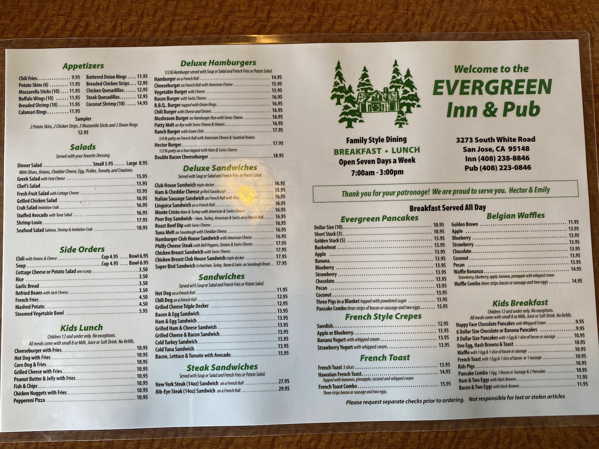 The menu is HUUUGE! There is something on it for everyone. As my husband recently noted though, he doesn't think they're serving Menudo anymore, which is fine by me since I don't eat the stuff, but for those people who do, I guess it sucks. Anyhow, they have tons of omelettes, pancake & French toast combo's & fancy waffle items. 2 of their biggest breakfast's are the Ranch bkfst & the Emily's. They come w 3 eggs, 3 sausage &...yes, AND 3 bacons, plus hash browns & toast, which I substitute for Fr. toast. The Emily's also comes w a 1/2 piece of ham, I believe. $16 or so ea. They also have a huge lunch menu to choose from. One of my favorites is the Rib-eye steak sandwich. They also have lots of burgers, sandwiches & other stuff, not to mention, salads as well. There might be a wait around the popular bkfst hours, but they're pretty efficient & quick at seating & serving everyone. They also hace a full bar/lounge where u can watch sports & eat as well. The lounge stays open late, 1:00 or 2:00 am if I'm not mistaken. Anyhow, to my own detriment, I highly recommend this place if you're hungry & want a good, filling meal...