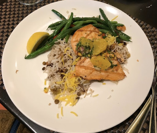 We ordered the Pasta ( vegetarian) and pasta with jumbo prawns alongwith the Salmon (with veggies) a Kabob combo platter and a Chicken kebab order which happened to be for about 4-5 folks on the table.