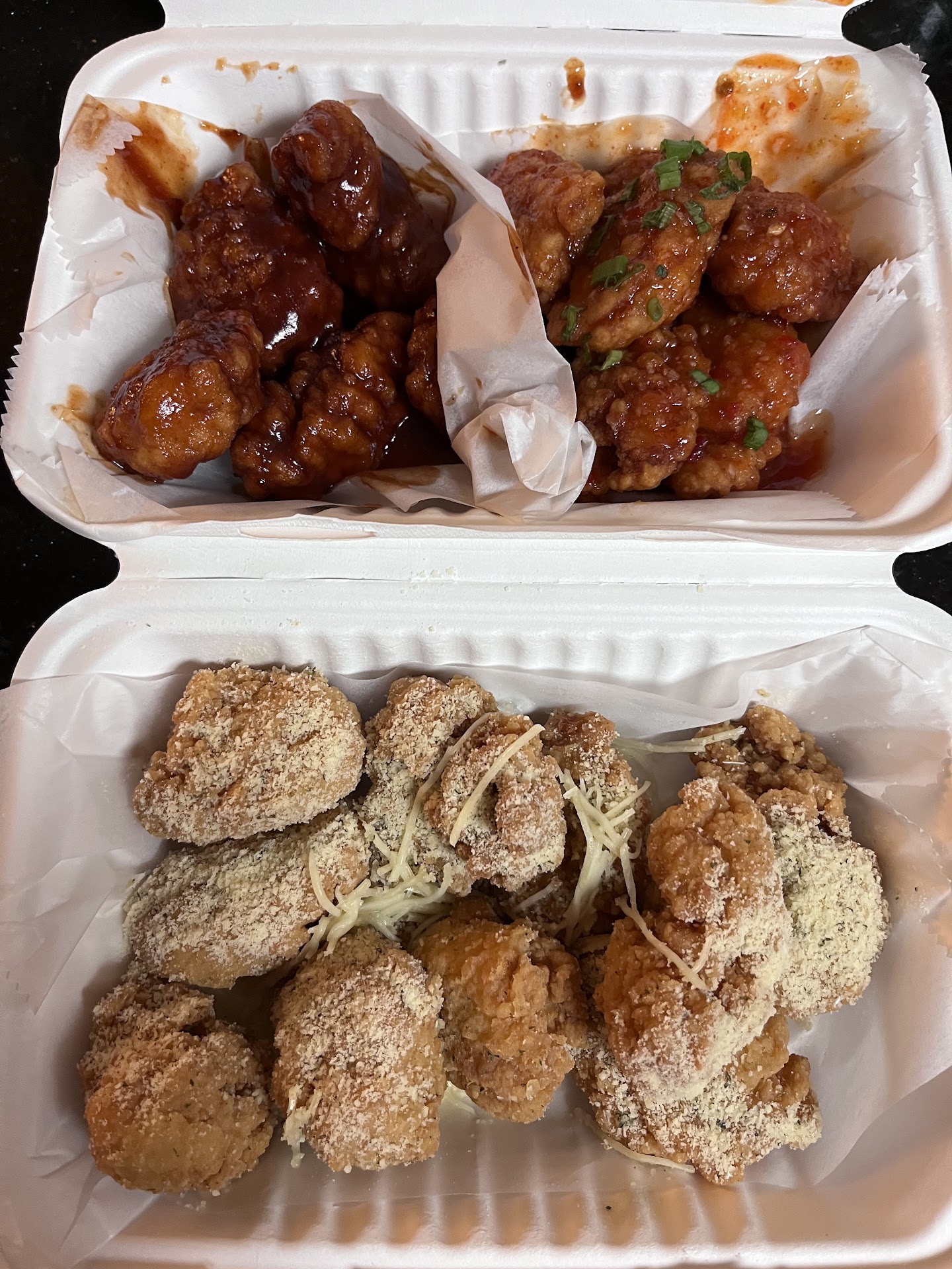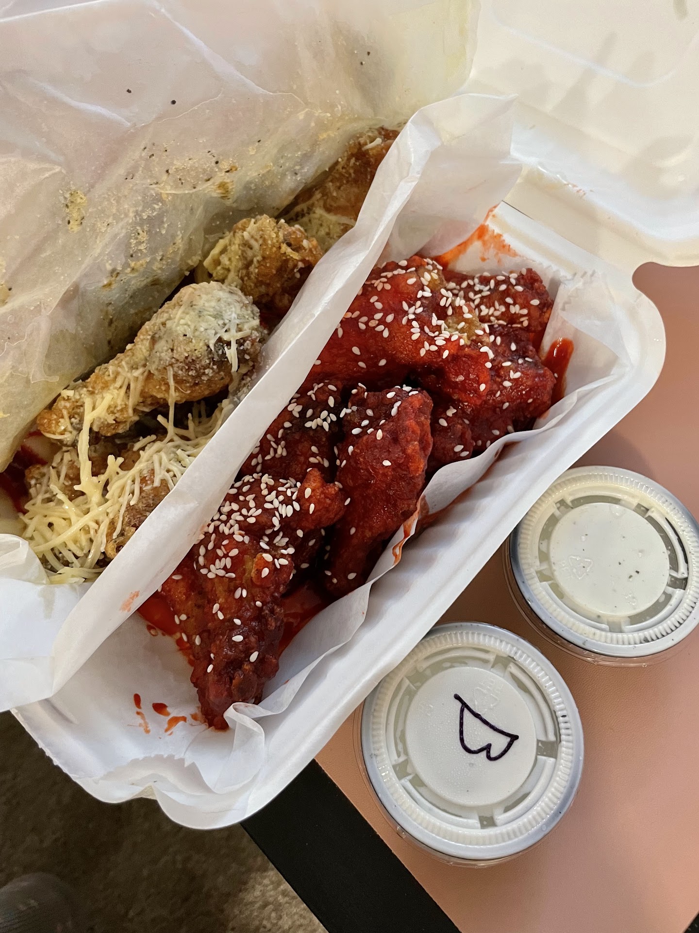 We got three flavors: Peking, Garlic Parmesan, and Lemon Pepper. Among them, my favorite is the Garlic Parmesan! Can't go wrong. On the other hand... The Lemon Pepper wings were TOO SALTY. Very heavily seasoned and needed to be dunked in ranch. The Peking wings were tasty, but definitely on the sweeter side. Not a bad choice.