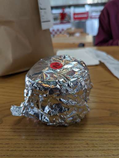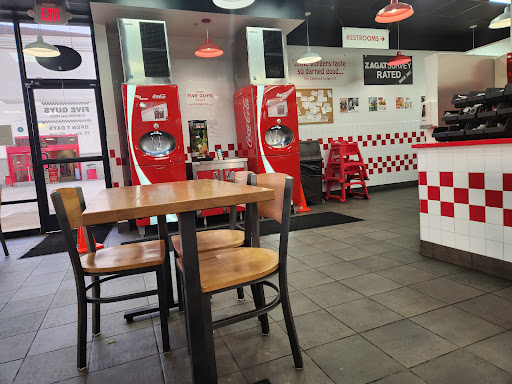 Read moreThis was my first time eating at Five Guys. It was clean inside, easy to get to, and not busy, so we received our food very quickly. The cashier wasn't very helpful or informative despite my voicing that I was a newbie. The "burgers" listed are two patties. The "small burgers " are one. I chose the provided combo burger option, which includes mushrooms. The meat was perfect (fully cooked FYI), juicy, and savory. The mushrooms were on the bottom, and upon trying to lift my burger from the foil, I realized the bottom bun had melded into a soggy love relationship with the foil wrapper. The mushrooms didn't have any flavor, I'm unsure if they seasoned them at all. Overall, the burger was tasty, buns soft, fresh ingredients. I didn't notice there were two options for fries, I would have enjoyed trying the cajun fries. Regardless, the fries were perfect, and definitely no ketchup necessary! The prices make this a "treat," but with the wage issues going on here, it's not shocking...$30 for two burgers, one fry and drink. It's a very open floor plan, so customers can watch every step of the preparation, which is great. There's a huge box of peanuts in shell that's offered with cardboard boats and buffet style. I did not realize that there was peanut oil used for cooking. Lastly, almost no plastic waste! Yay! Serious...