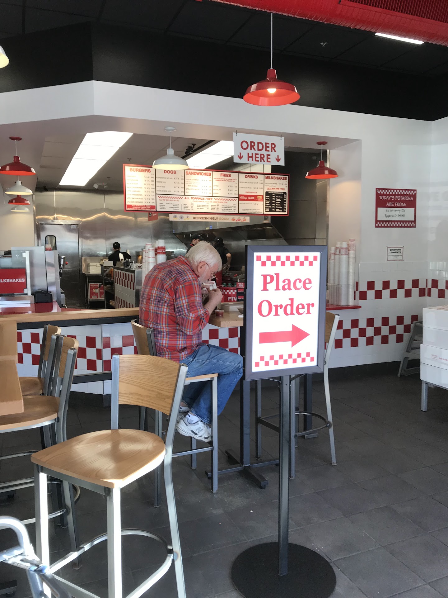 This is the newest 5 Guys around. The inside is very nice and the employees keep it clean. The employee taking my order was friendly. Not sure if this is now true for all the 5 Guys but... they have green peppers now and you can get them grilled or fresh. I ordered the regular 2 patties with bacon and cheese and added grilled onions, lettuce, tomato, BBQ sauce, grilled mushrooms and grilled peppers. This thing was so darn big I could that I had to get a fork and knife “no joke” and as usual I get a small fry... I think it’s a running joke with all the 5 guys, they will toss in a super small cup with like 2 French fries in it and them unload a whole basket of fries in da bag!!! “Again, no joke” “love 5 guys!!!x10” Only- was the service was a little slow but no big deal I’ll wait for food...