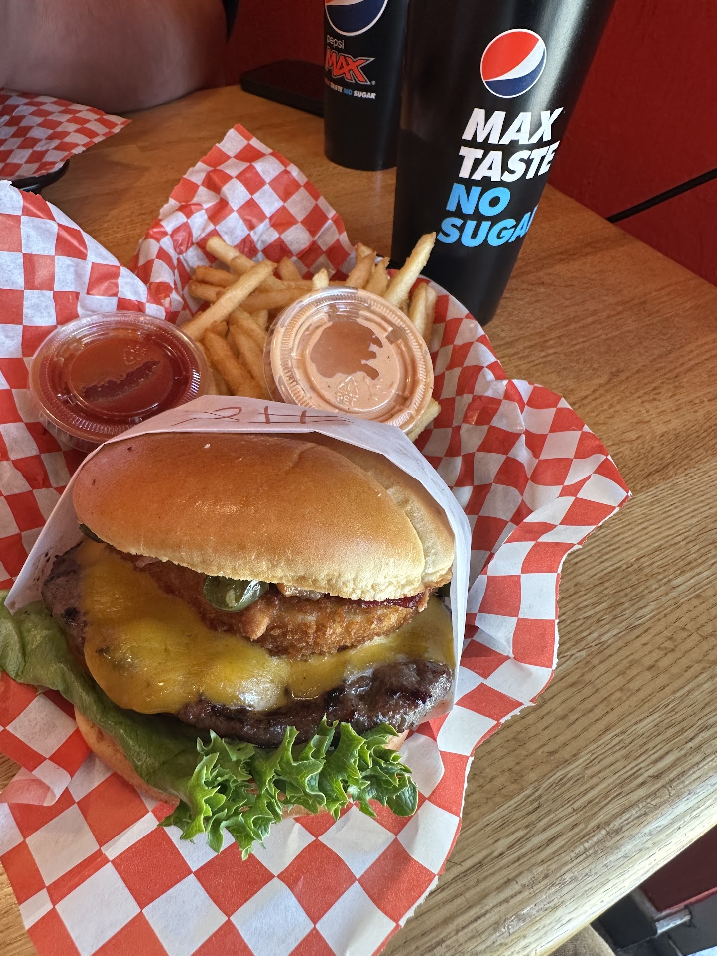 Read moreWas passing and it seemed nice and clean with comfy looking seating. Whilst waiting for it to be cooked noticed the friendly team welcoming people as they came in rather than the usual grunt you might get at some places. Had a combo of drink, double burger and fries for about $15. Real crisp light fluffy fries with a really nice double burger packed with fresh salad. And the burger just had that perfect flame grilled taste and juiciness blend. Donât know what more you could want really from a burger and fries. Was delicious and in a par with other similar priced places. Must have been good quality too overall as didnât repeat on me once afterwards. I liked this more than the in and out burgers which are really popular over here, as it was all just generally less greasy. Have a feeling would revisit although only here for a week so wonât be a...