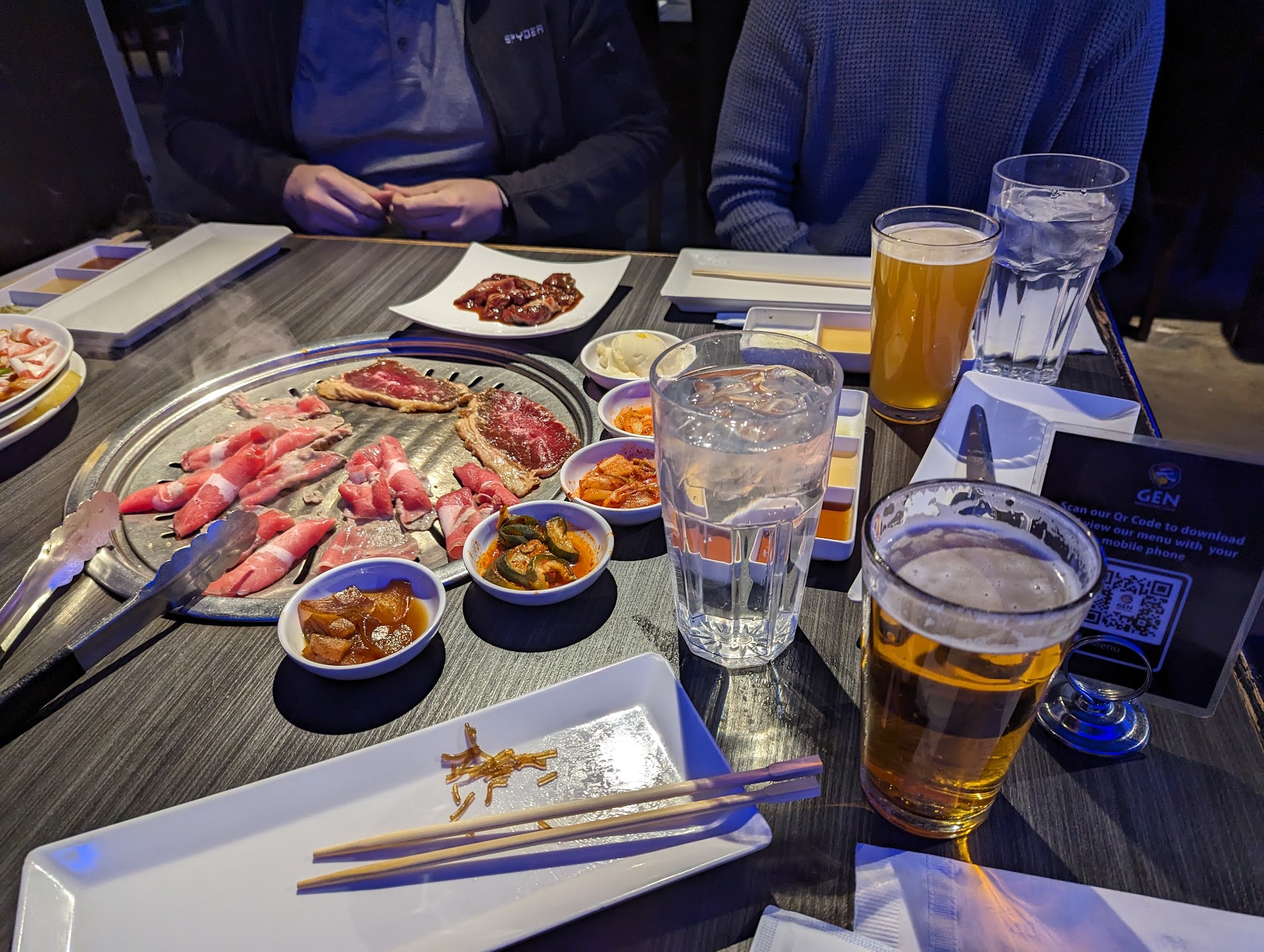 Read moreThis place is crazy popular. Expect to wait for a decent amount of time if you don't have reservations and reservations is highly recommended. Not having had reservations we came with a party of nine and when it was time for our seating we were surprised to find us trying to seat us at two separate tables that were adjacent to each other but not connected which we had to decline because it would not satisfy our desire to socialize together if we could not be seated at the same table. I only mention this because it seems to me that they do such good business that they could offer such an accommodation to their patrons and most might take it because seating is difficult to get in a good amount of time but most will accept it. I personally don't think an establishment should offer that even if they are making money hand-over-fist. We decline this and eventually got a proper sitting as we preferred. Our server was polite however it still was a bit of an odd experience as we did not get served in a timely efficient manner to start, but eventually the pace Gru to the speed and response that we expected to have to begin with. If you've ever been to Korean barbecue before than you more or less know what to expect. you can order two plates of raw food to cook on the grill and can order two more as soon as your plates are on the grill but can never have more than two plates at any given moment of raw meat. Every setting comes with a spread of Korean sides that include things such as tofu and kimchi and it is bottomless they will refill you all night long if needed. Overall I don't find this restaurant to be particularly different than other Korean BBQ establishments. The interior is relatively dark and more modern and presents a bit like a nightclub. I imagine the popularity is due to its appeal to a younger and somewhat hipper crowd. Although I don't think you will be dissatisfied with your experience here, for my personal tastes the wait is not worth the experience. but do not let this deter you from trying it out if you are a fan of Korean barbecue and don't mind a beautiful wait for what is likely a decent Korean BBQ outing.