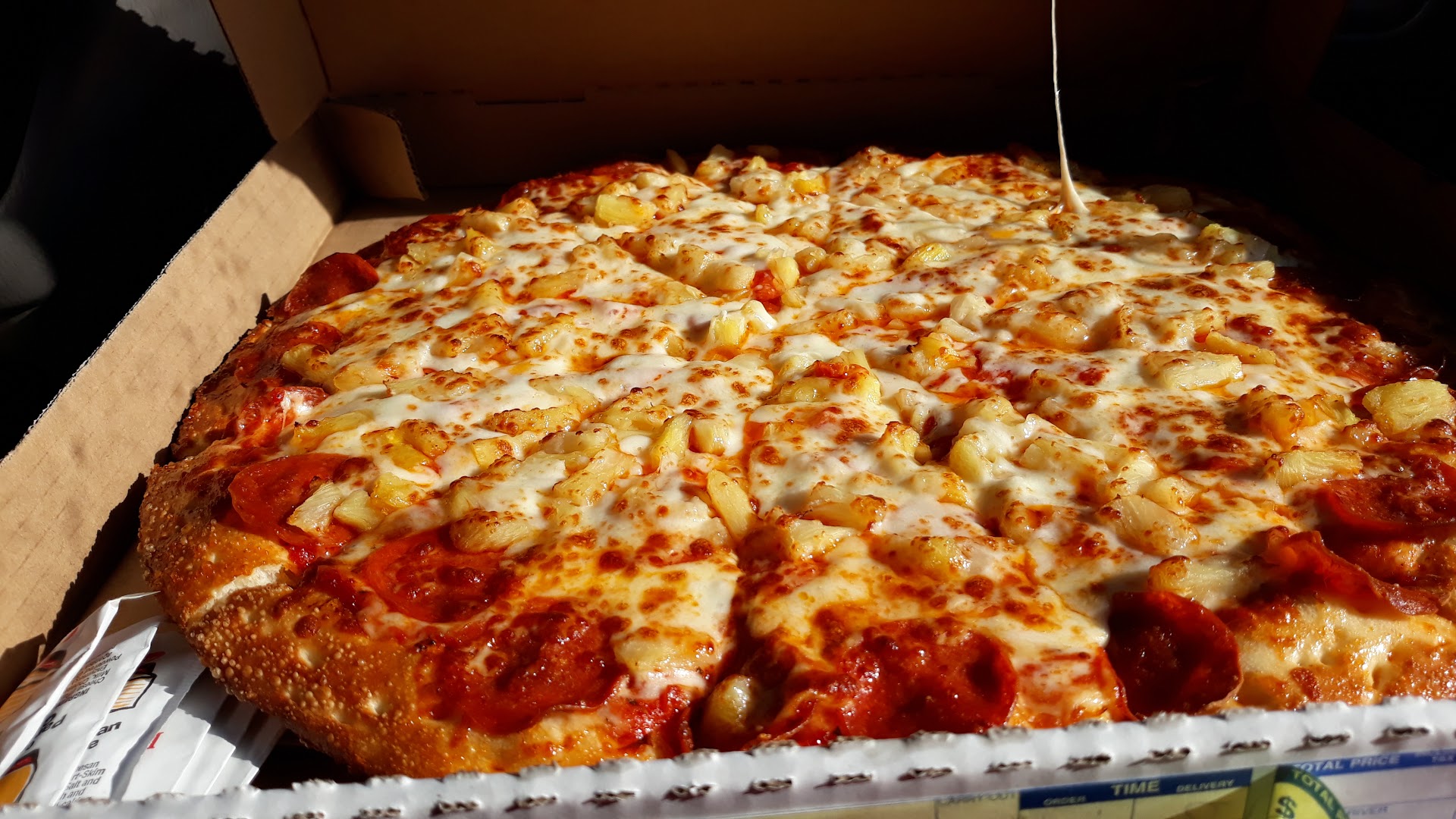 Update 1/13/16 I recently called in an order with a special request - half with cheese, half without. When I arrived, they'd substituted the word "cheese" with "sauce" and the whole pizza had cheese. Not to worry, though! They made a replacement pizza lickety-split and gave me extra pineapple and a discount to make up for the error. Super friendly service, too. The man behind the counter chatted with me like we were old friends, even though I'd never been inside the storefront.