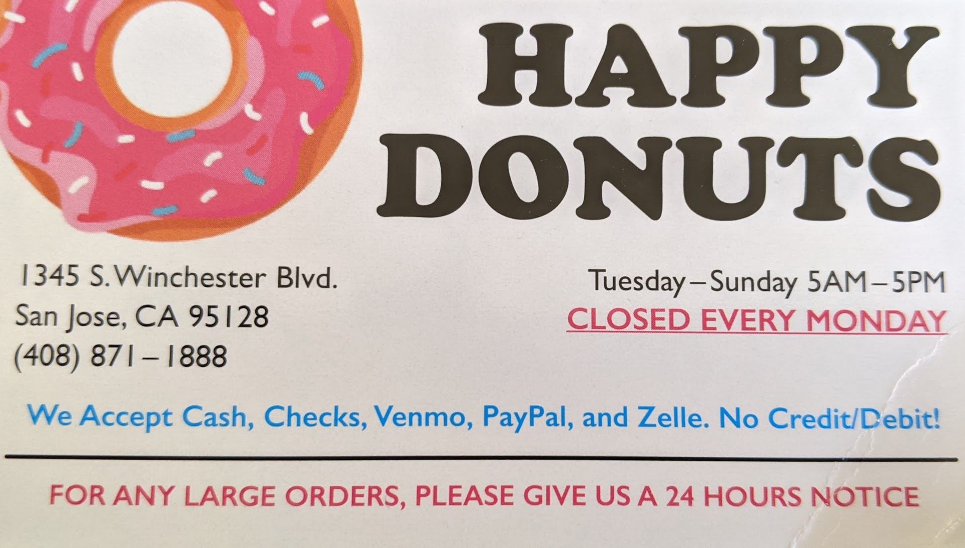 Read moreThis donut shop was just wonderful and the staff was so sweet and kind! We are traveling from out of town and after trying and failing to get donuts from two different places (due to lack of cash/low donut stock) this tired mama was so thankful to find Happy Donuts! Not only did they have a good variety, but the prices were very reasonable! I had my toddler and infant with me and the woman helping us threw in a few donut holes for my daughter, gave me a little extra coffee, and even helped me to bring my things out to my car. Thank you for blessing us! I wish we lived in town so that Happy Donuts could be our...